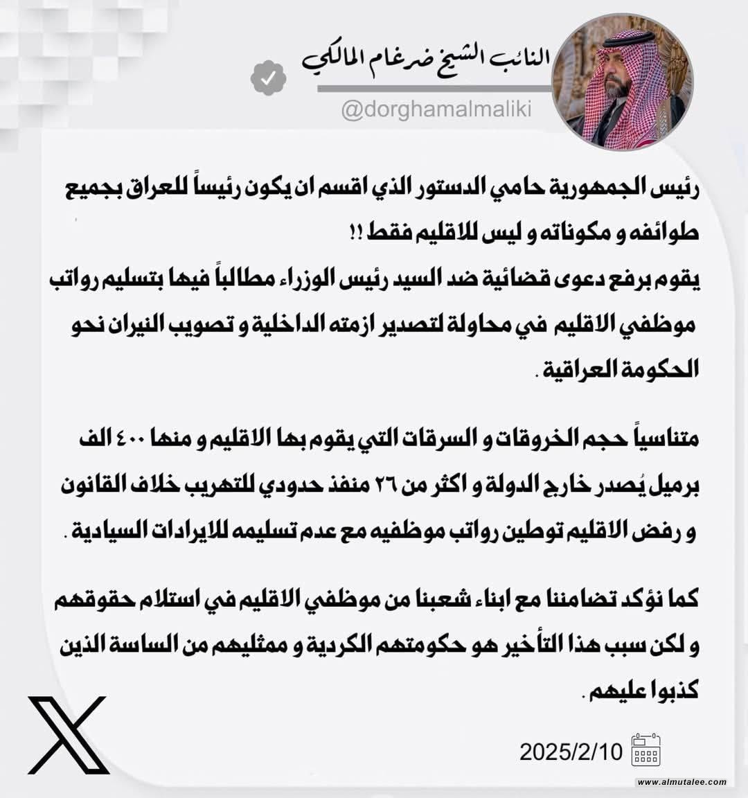 وقال المالكي في تغريدة تلقتها "المطلع"، إنه: