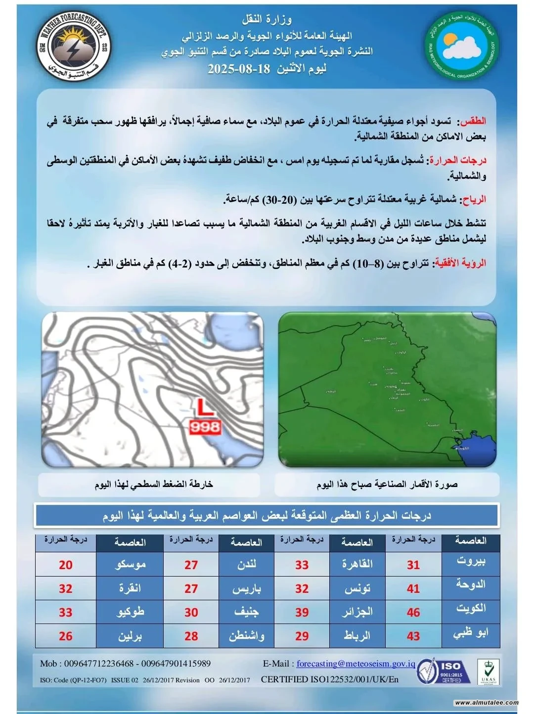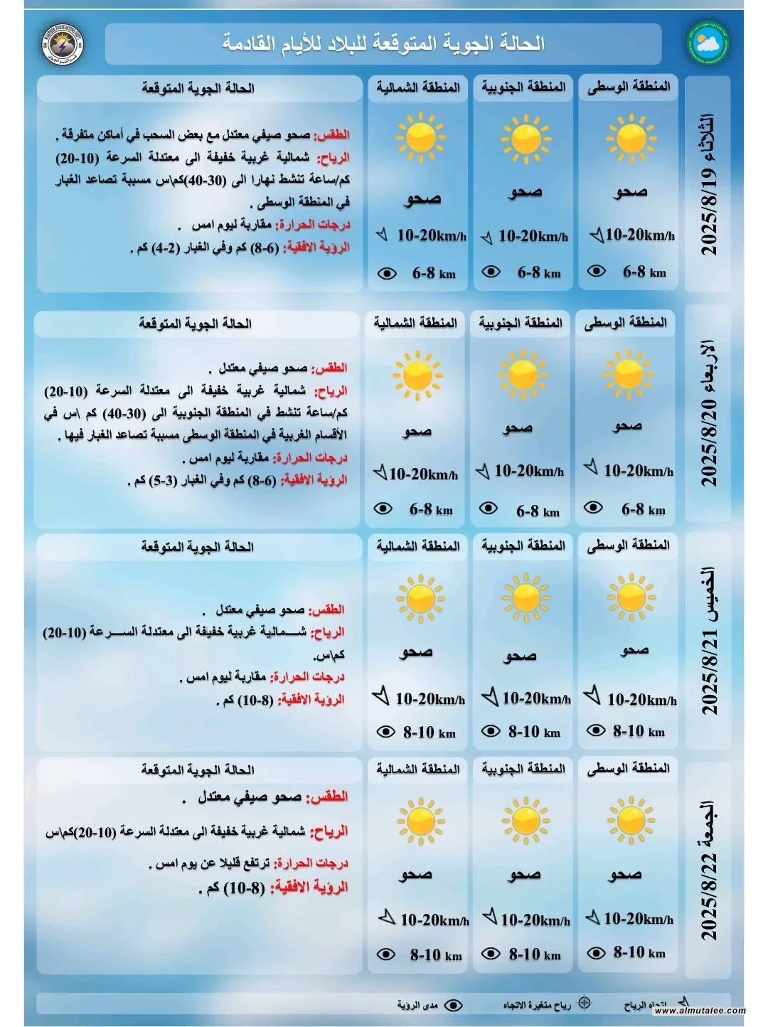 أعلنت هيئة الأنواء الجوية، اليوم الإثنين، حالة طقس العراق خلال الأيام المقبلة، وفيما أشارت إلى أجواء صيفية معتدلة مع درجات حرارة تنخفض بشكل طفيف، توقعت تصاعداً للغبار .