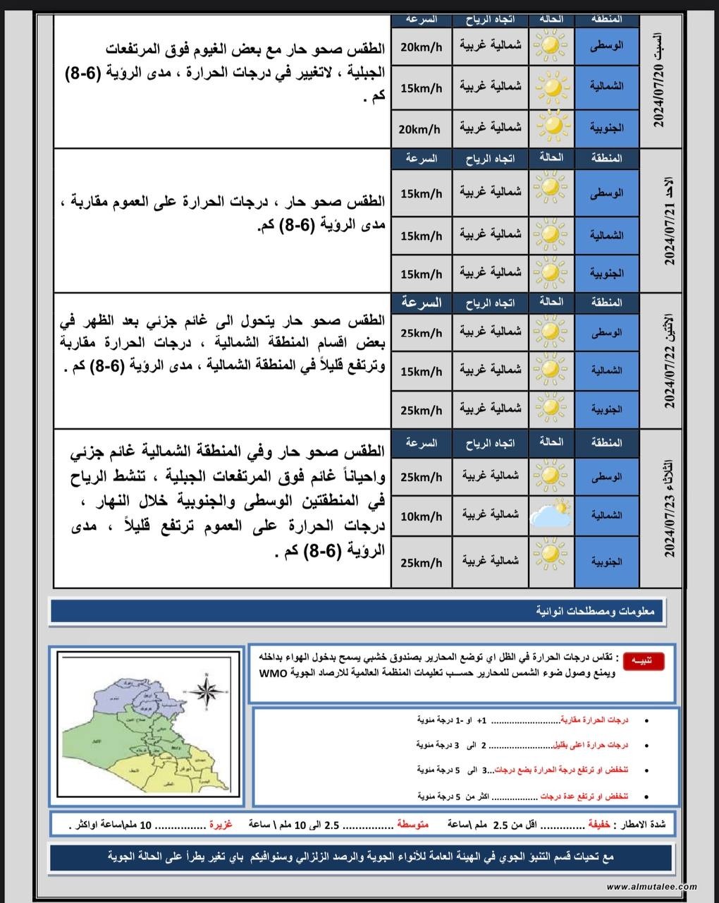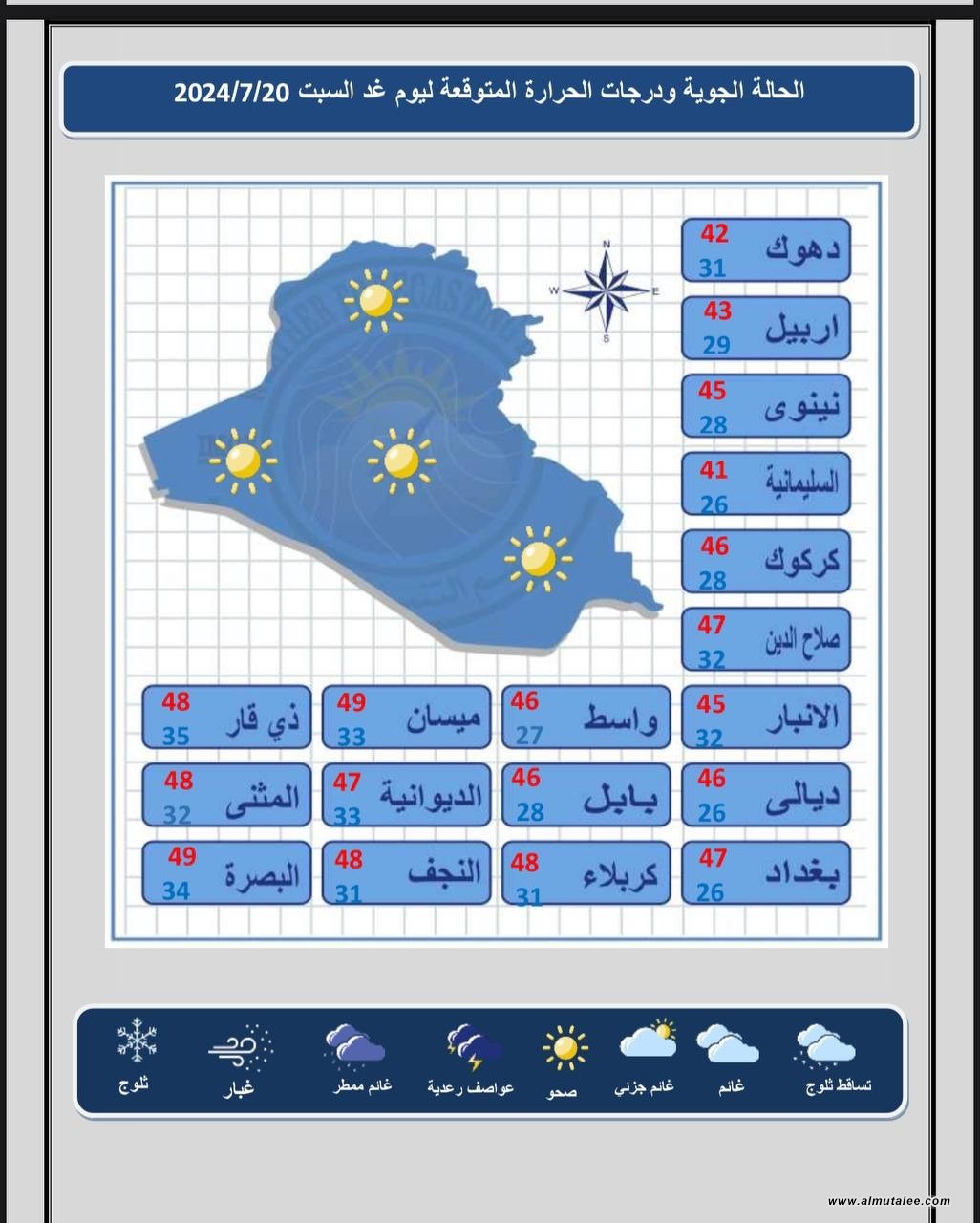 نشرت هيئة الأنواء الجوية، اليوم الجمعة، توقعاتها لأجواء العراق خلال الأيام القادمة، فيما أكدت “استمرار الطقس صحوا بدرجات حرارة تلامس الـ50 مئوية مع احتمالية ارتفاعها أكثر في المنطقة الشمالية”.