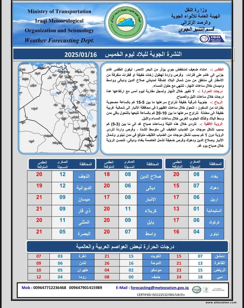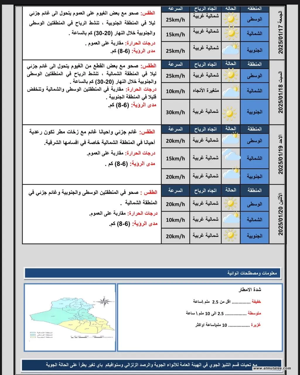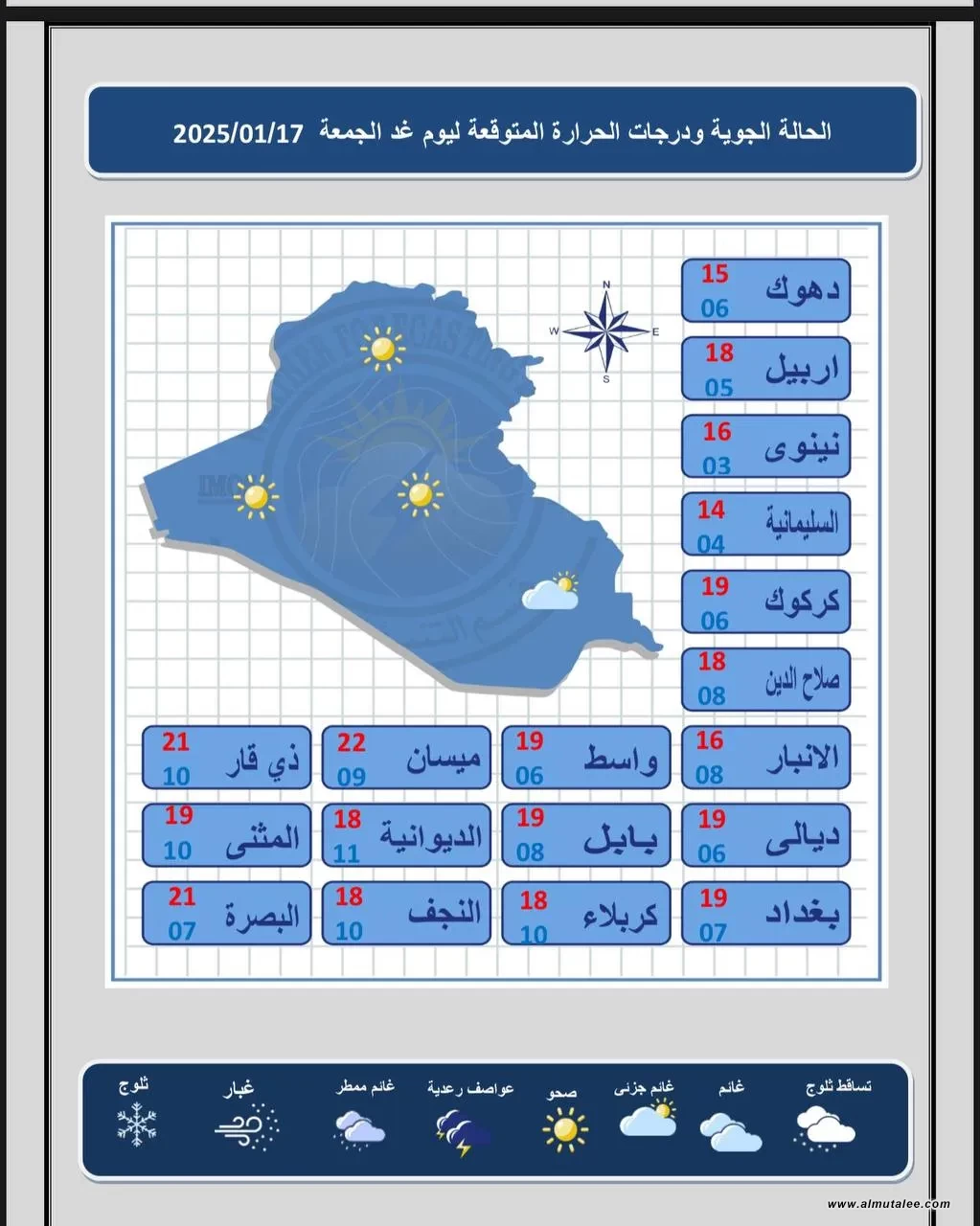 تنشر المطلع، اليوم الخميس، أحوال حالة الطقس بالعراق خلال الأيام المقبلة.