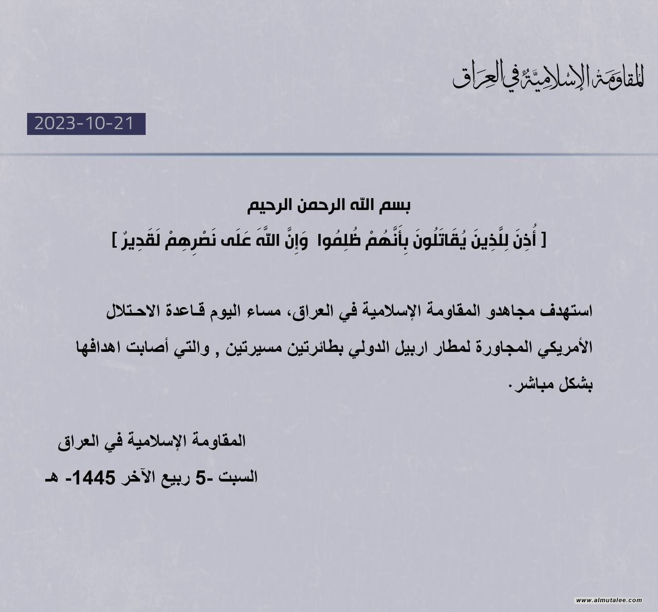 أعلنت فصائل المقاومة العراقية ،مساء اليوم السبت، استهداف "قاعدة الحرير" قرب مطار أربيل الدولي.