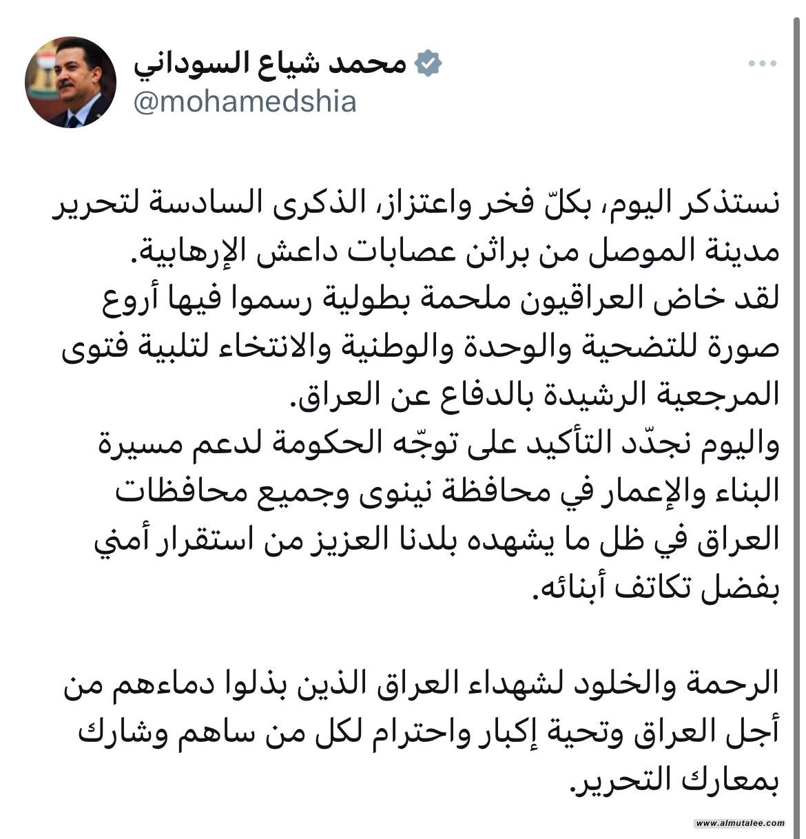 وقال السوداني في تغريدة: "نستذكر اليوم، بكلّ فخر واعتزاز، الذكرى السادسة لتحرير مدينة الموصل من براثن عصابات داعش الإرهابية".