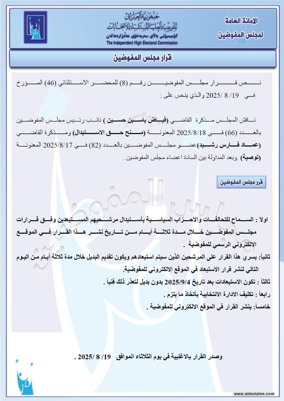 ئەمڕۆ چوارشەممە ٢٠ـی ئابی ٢٠٢٥، كۆمسیۆنی باڵای هەڵبژاردنەكانی عێراق بڵاویکردەوە، بەپێی رێكاری نوێ، هەر كاندیدێك لەدوای رۆژی ٤ـی ئەیلولەوە دووربخرێتەوە، كاندیدی جێگرەوەی بۆ دانانرێت، لەرووی هونەرییەوە توانای نییە لەدوای ئەو رێكەوتەوە كاندیدی جێگرەوە وەربگرێت.