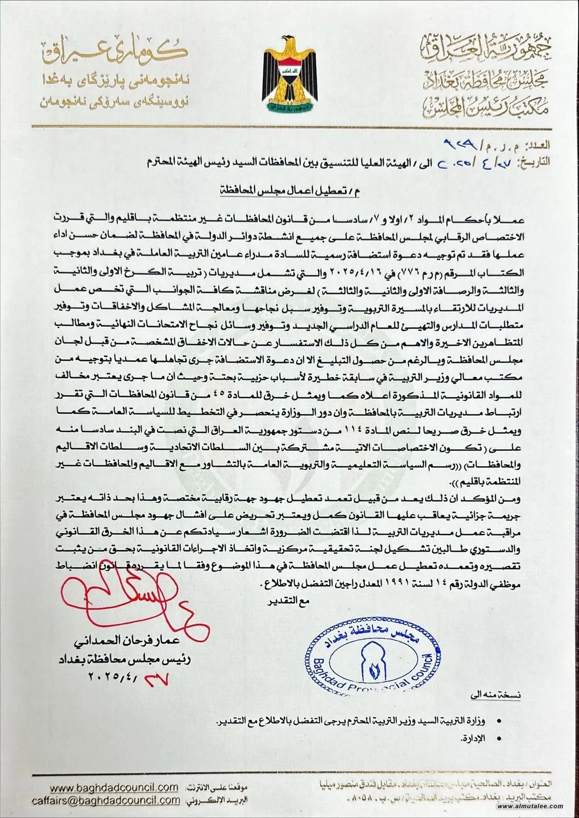 خاطب رئيس مجلس بغداد، علي فرحان الحمداني، الهيئة العليا للتنسيق بين المحافظات لتشكيل لجنة تحقيقية بحق وزير التربية.