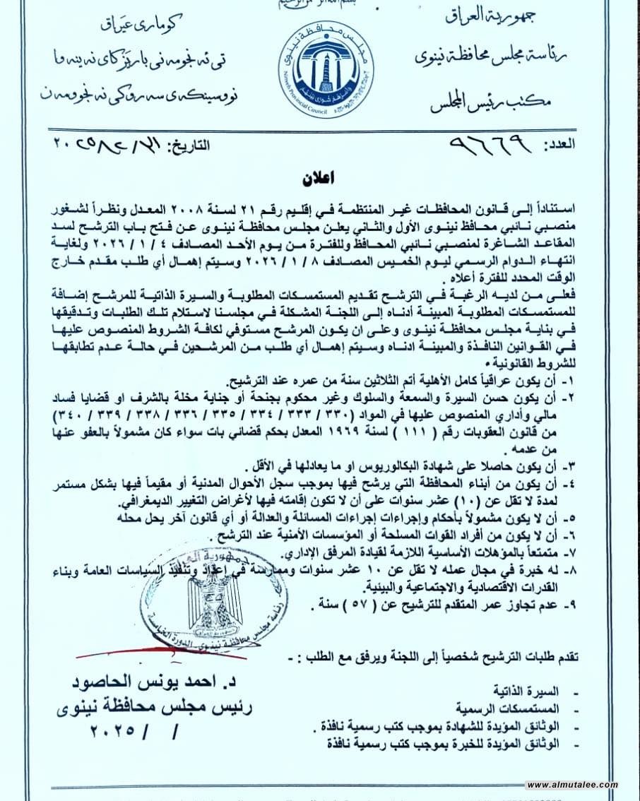 أعلن مجلس محافظة نينوى، اليوم الأربعاء، فتح باب الترشيح لشغل منصبي نائبي محافظ نينوى، وذلك استناداً إلى الضوابط القانونية المعتمدة.