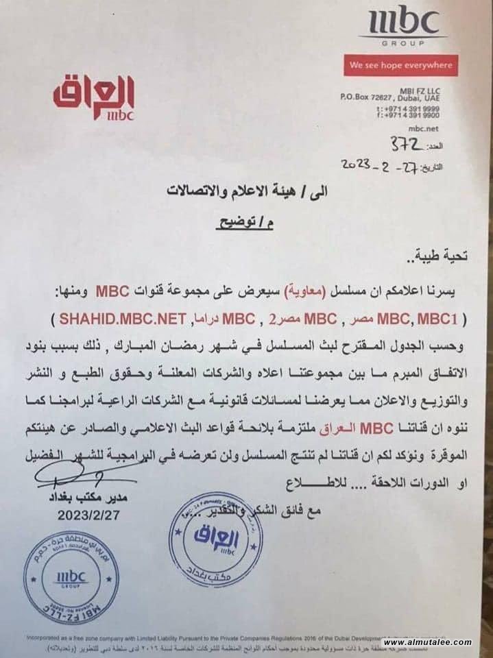 التطور الجديد، تمثّل بصدور بيان توضيحيّ عن قناة "أم بي سي العراق" وُجّه إلى هيئة الإعلام والاتّصالات، أشارت فيه إلى أنّ قناة "أم بي سي" قرّرت عرض مسلسل "معاوية" على كافة قنواتها ما عدا قناة "أم بي سي العراق"، وجاء في البيان: "يسرّنا إعلامكم أنّ مسلسل "معاوية" سيُعرض على مجموعة قنوات "أم بي سي" ومنها: MBC1، MBC مصر، 2MBC مصر، MBC دراما، منصّة "شاهد". وحسب الجدول المقترح لبثّ المسلسل في شهر رمضان، ذلك بسبب بنود الاتّفاق المبرم ما بين مجموعتنا أعلاه والشركات المعلنة وحقوق النشر والطبع والتوزيع والإعلان، ما قد يعرّضها لمساءلات قانونيّة مع الشركات الراعية لبرامجنا. كما ننوّه أنّ قناتنا MBC العراق ملتزمة بلائحة قواعد البثّ الإعلاميّ والصادر عن هيئتكم الموقّرة، ونؤكّد لكم أنّ قناتنا لم تنتج المسلسل ولن تعرضه في البرامجيّة للشهر الفضيل أو الدورات اللاحقة".
