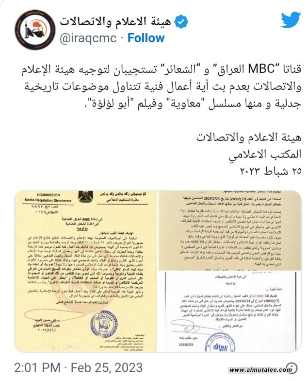 وجاء في بيان هيئة الإعلام والاتّصالات العراقيّة: "استناداً إلى الصلاحيّات الممنوحة لهيئة الإعلام والاتصالات لتنظيم قطاع الإعلام في جمهورية العراق، وبعد الرصد والمتابعة وورود العديد من الشكاوى المجتمعية إلى الهيئة، في خصوص نيّة قناتكم بثّ أعمال فنية تتناول موضوعات تاريخية جدليّة، ومنعاً من حدوث أيّ سجال مذهبيّ، خاصّة في شهر رمضان المبارك، توجّه هيئة الإعلام والاتصالات قناتكم بعدم بثّ أيّ عمل فنّيّ من شأنه إذكاء السجال والجدل المذهبيّ حفاظاً على أجواء الشهر الكريم، واستقرار البلاد والسلم المجتمعيّ."