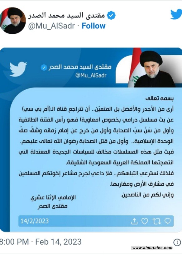 المعارضة الأثقل جاءت على لسان الزعيم الشيعيّ العراقيّ  مقتدى الصدر، الذي رأى أنّه "من الأجدر والأفضل، بل المتعيّن أن تتراجع قناة الـ"أم بي سي" عن بثّ مسلسل دراميّ بخصوص (معاوية)، فهو رأس الفتنة الطائفيّة، وأوّل من سنّ سبّ الصحابة، وأوّل من خرج عن إمام زمانه وشقّ صفّ الوحدة الإسلاميّة، وأوّل من قتل الصحابة رضوان الله تعالى عليهم"، معتبراً أنّ "بثّ هذه المسلسلات مخالف للسياسات الجديدة المعتدلة التي انتهجتها المملكة العربيّة السعوديّة الشقيقة".