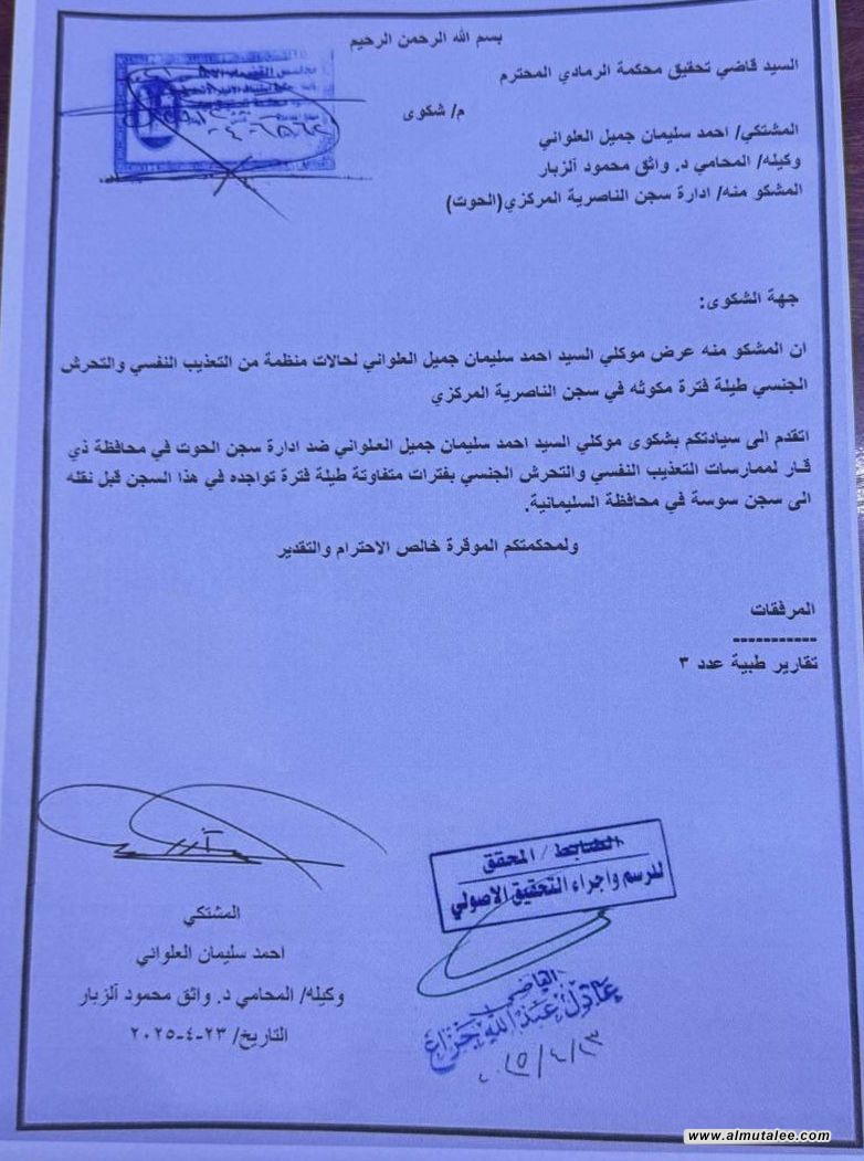 ووفقا للشكوى المقدمة الى قاضي تحقيق محكمة الرمادي، فإن العلواني أدعى فيها بأنه قد تعرّض إلى "حالات منظمة من التعذيب النفسي والتحرش الجنسي طيلة فترة مكوثه في سجن الناصرية المركزي".