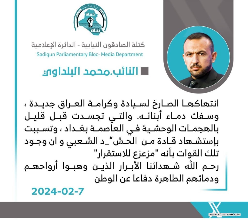 وذكر البلداوي في تدوينة على منصة (أكس) وتابعتها “المطلع”، “انتهاكها الصارخ لسيادة وكرامة العراق جديدة وسفك دماء أبنائه والتي تجسدت قبل قليل بالهجمات الوحشية في العاصمة بغداد وتسببت بإستشهاد قادة من الحشد الشعبي”.