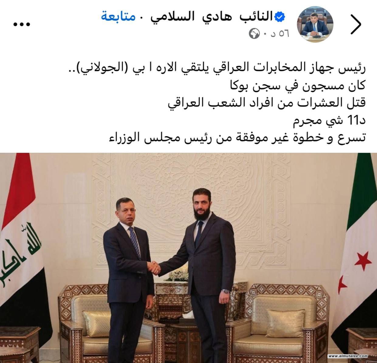 انتقد النائب عن محافظ النجف هادي السلامي، اليوم الخميس، لقاء جهاز المخابرات العراقي حميد الشطري برئيس الإدارة السورية أحمد الشرع، المعروف ب “الجولاني”، واصفاً الخطوة “بالمتسرعة وغير الموفقة” من قبل رئيس الوزراء، لافتاً إلى أن الجولاني “داعشي مجرم قتل العشرات من العراقيين”.