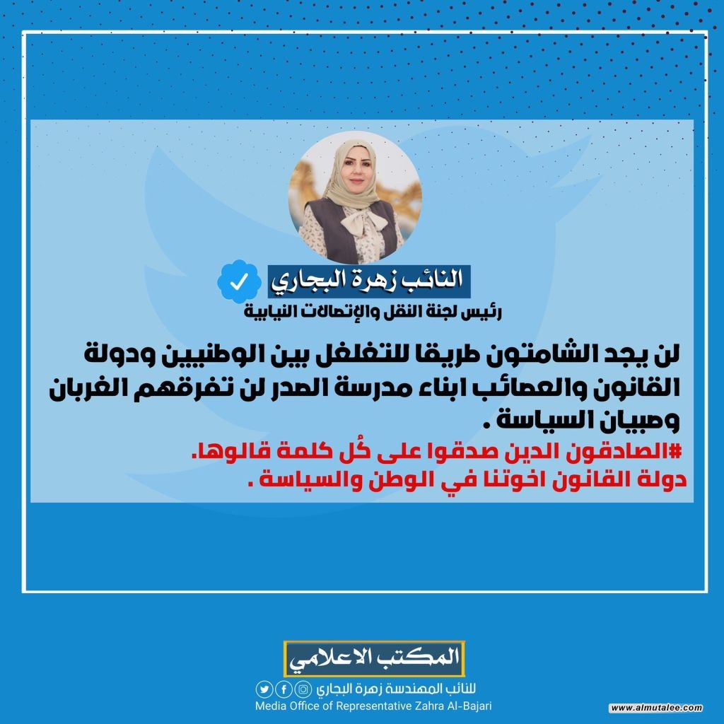 وقالت البجاري في تغريدة تابعتها المطلع:"لن يجد الشامتون طريقاً للتغلغل بين الوطنيين ودولة القانون والعصائب أبناء مدرسة الصدرلن تفرقهم الغربان وصبيان السياسة".