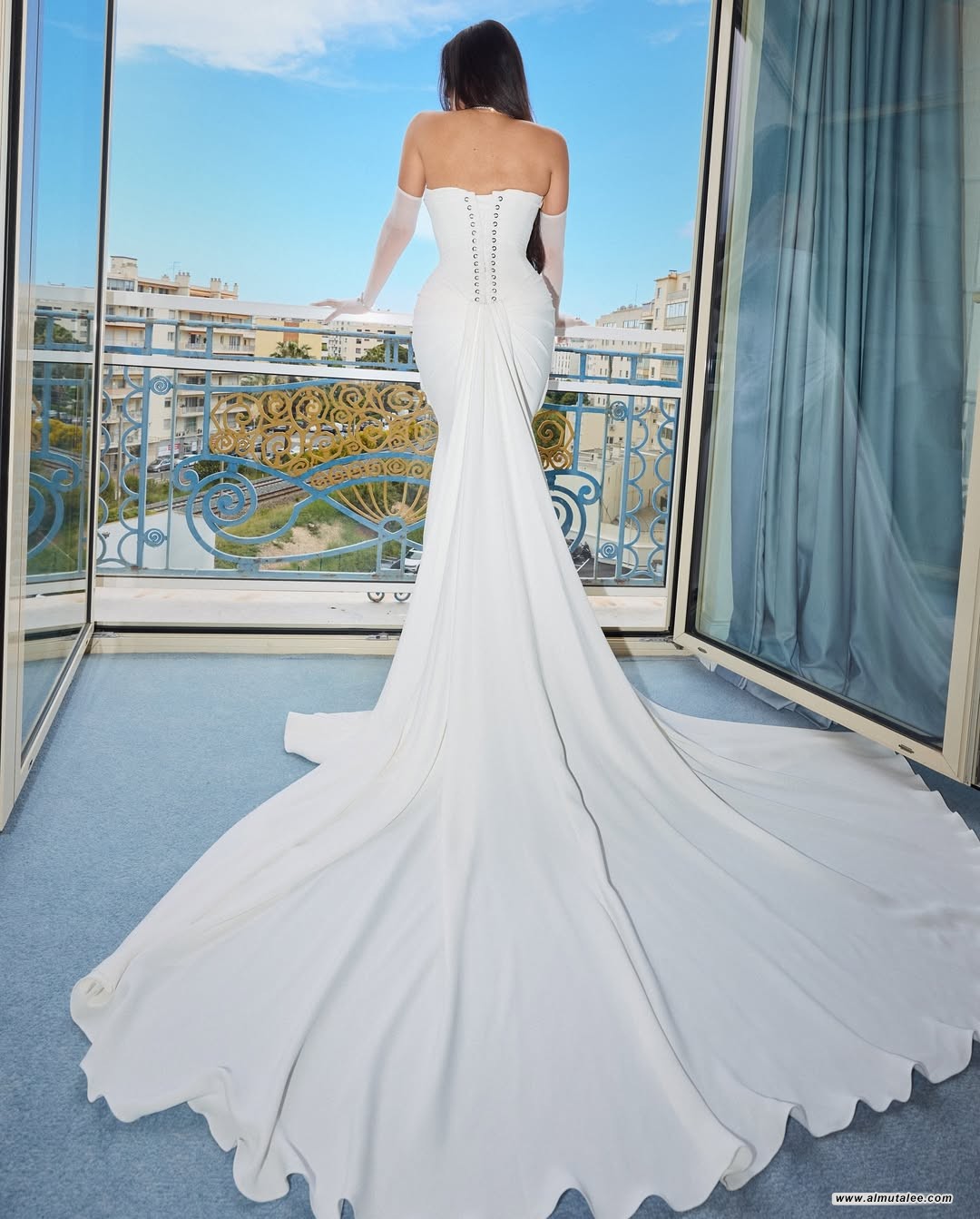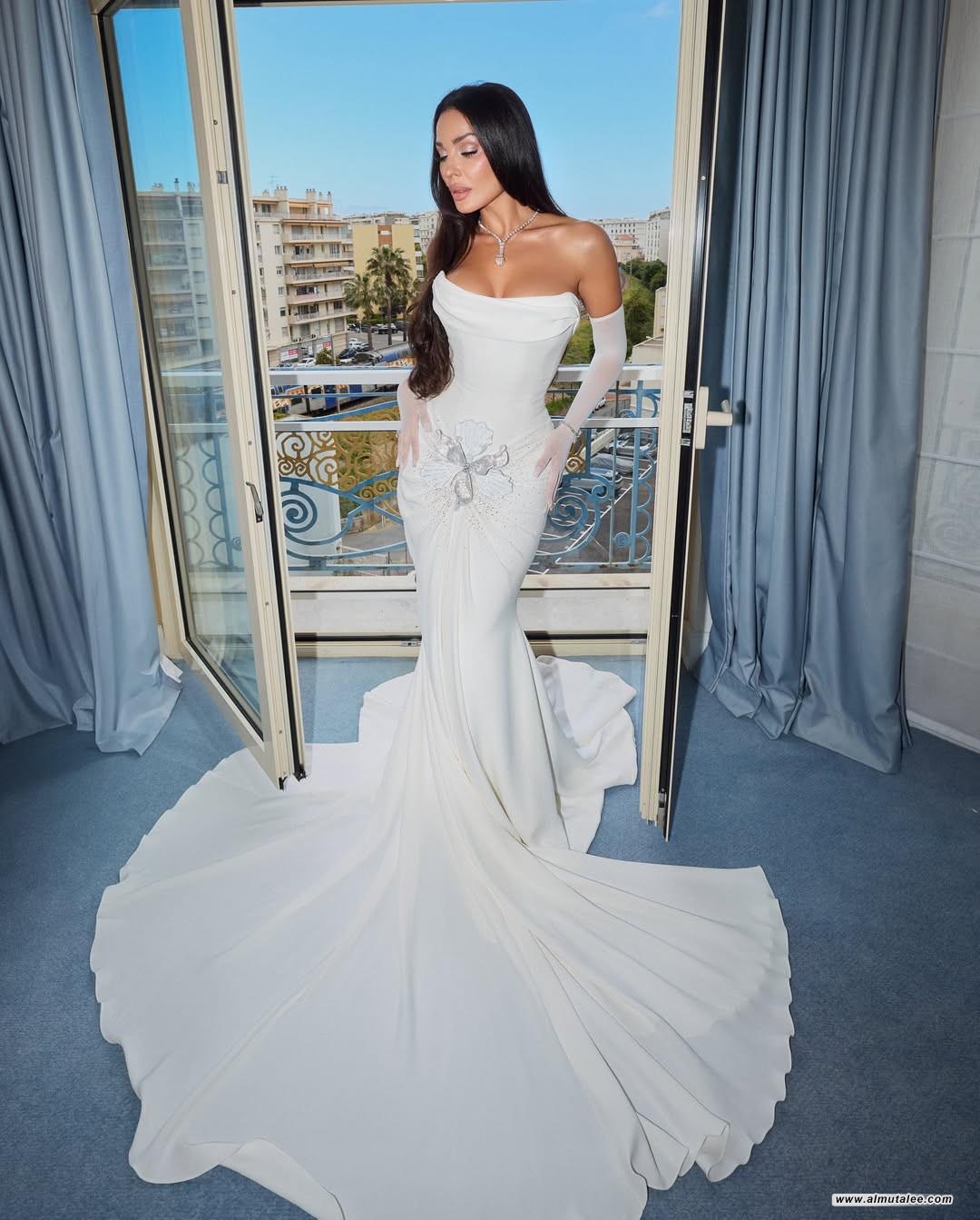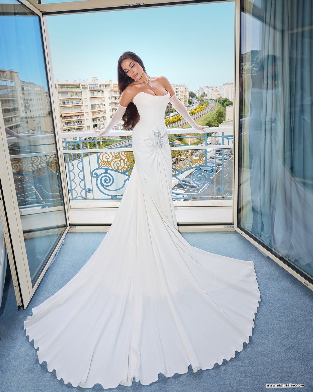 وامتاز الفستان بقصّته الناعمة التي انسابت برقي، وزيّن بتفاصيل مبتكرة عند الخصر على شكل طيات هندسية أضافت عليه لمسة عصرية مميزة.