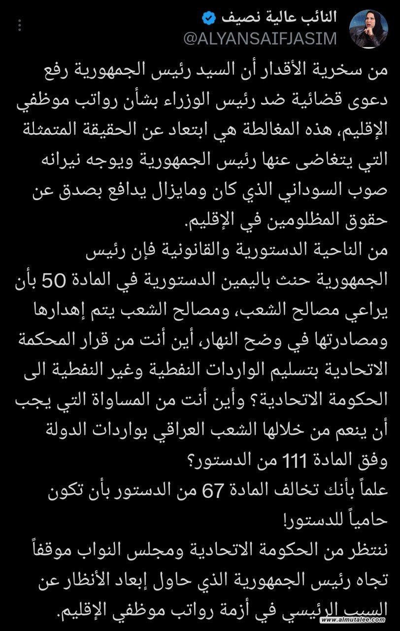 نصيف تسخر من دعوى رشيد ضد السوداني: ننتظر من الاتحادية موقفا واضحا