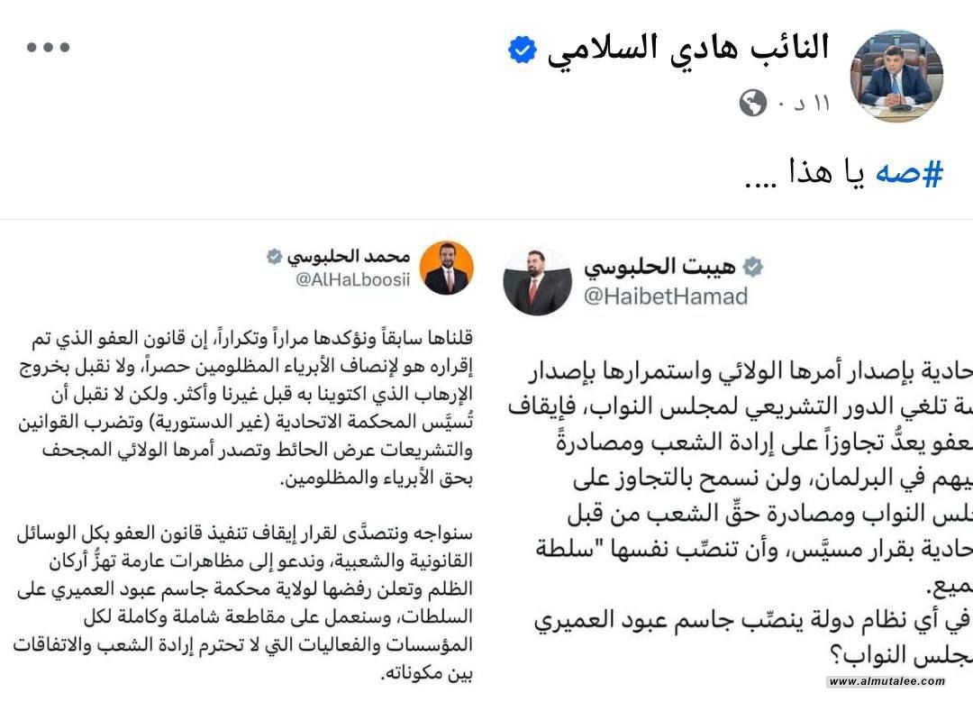 هادي السلامي يرد على تعليق الحلبوسي بخصوص قانون العفو العام: "صه ياهذا"