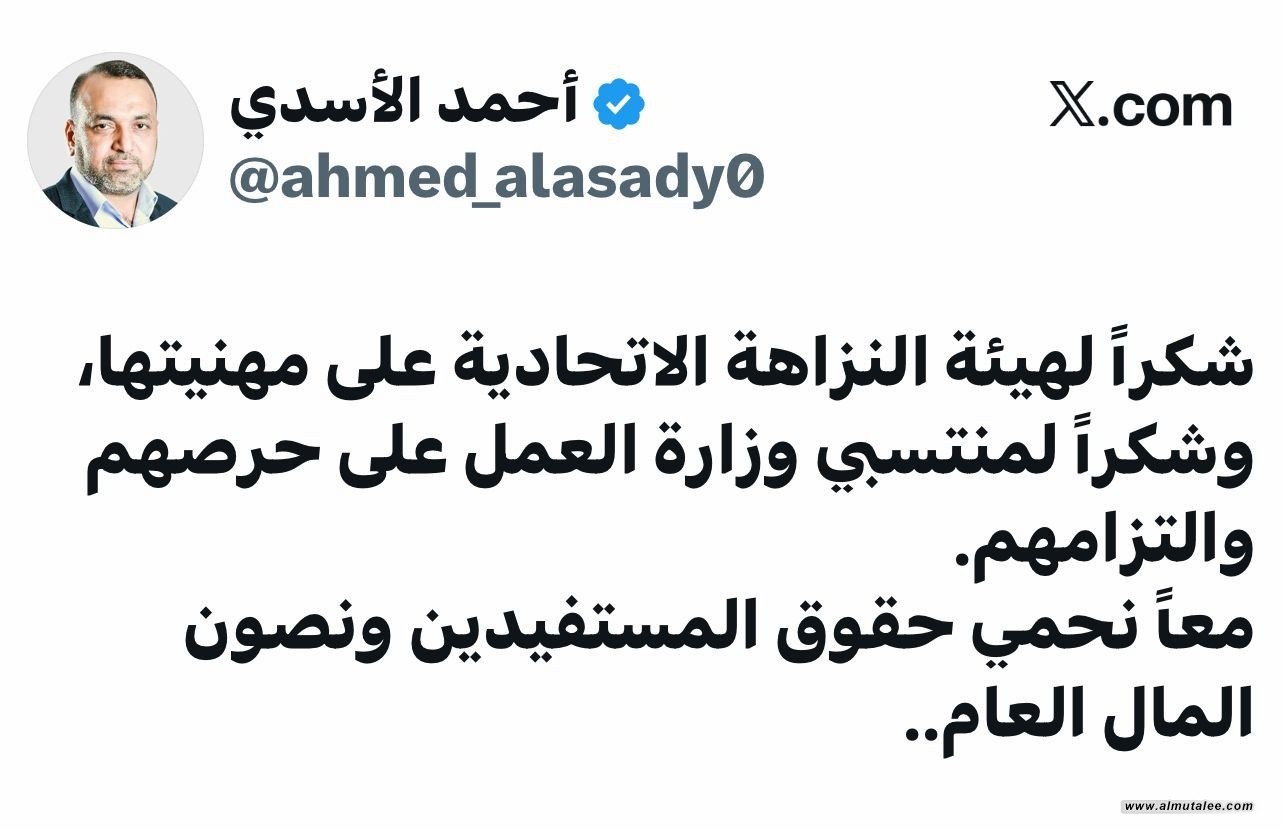 واختتم الأسدي منشوره بالتأكيد على أهمية حماية حقوق المستفيدين والحفاظ على المال العام، قائلاً:"معاً نحمي حقوق المستفيدين ونصون المال العام".