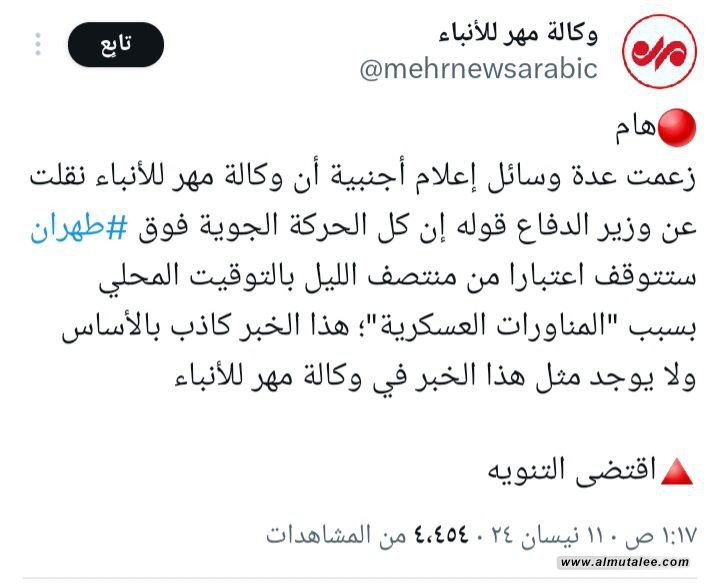 و يذكر أن الوكالة قد حذفت تغريدة لها ،تابعتها المطلع، كانت تقول فيها إن:"وزير الدفاع أعلن وقف الرحلات الجوية في سماء طهران بسبب مناورات عسكرية".