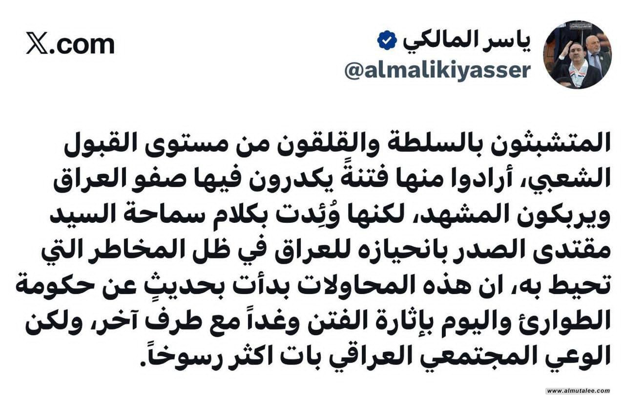 ياسر المالكي: فتنة أرادها المتشبثون بالسلطة وأطفأها كلام الصدر