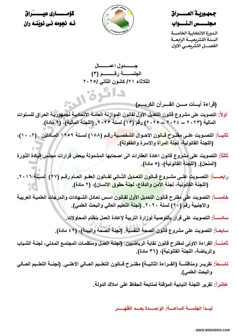 وبحسب وثيقة صادرة عن الدائرة الإعلامية للمجلس وتلقتها المطلع ، فأن جدول اعمال الجلسة يتكون من عشر فقرات على ان تبدأ الجلسة في الساعة الواحدة بعد الظهر".