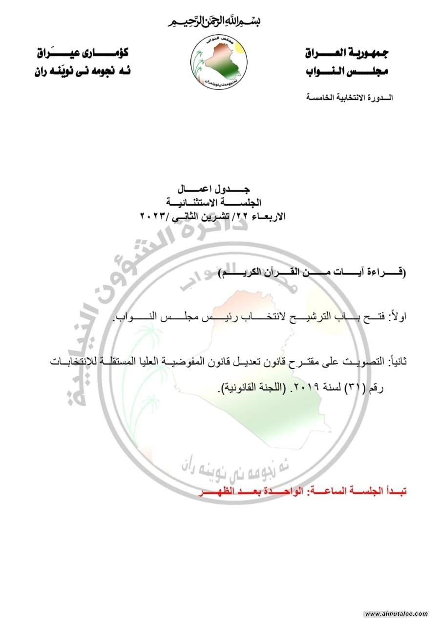 لە بەیاننامەیەکی ئەنجومەنی نوێنەراندا هاتووە " کارنامەی دانیشتنەکەی ڕۆژی چوارشەممە (22/11/2023) بریتییە لە کردنەوەی دەرگای خۆپاڵاوتن بۆ هەڵبژاردنی سەرۆکی ئەنجومەنی نوێنەران و دەنگدان لەسەر پێشنیاری یاسای هەموارکراوی کۆمسیۆنی باڵای سەربەخۆی هەڵبژاردنەکان."