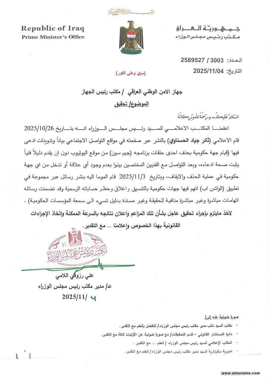 نفى مكتب رئيس مجلس الوزراء محمد شياع السوداني، علاقته بحذف المقابلة التي أجراها الإعلامي ثائر جياد الحسناوي، أو إغلاق حسابات الحسناوي وبرنامجه، موجهاً جهاز الأمن الوطني بفتح تحقيق بالمعلومات التي أدلى بها الحسناوي، وإعلان النتائج بالسرعة الممكنة.