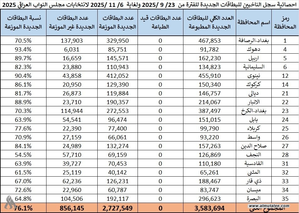 وذكرت المفوضية في بيان تلقته "المطلع"، أنها تعلن عن احصائية سجل الناخبين للبطاقات الجديدة للفترة من 23/9/2025 ولغاية 6/11/ 2025 لانتخابات مجلس النواب 2025 وكما موضح في الجدول أدناه: