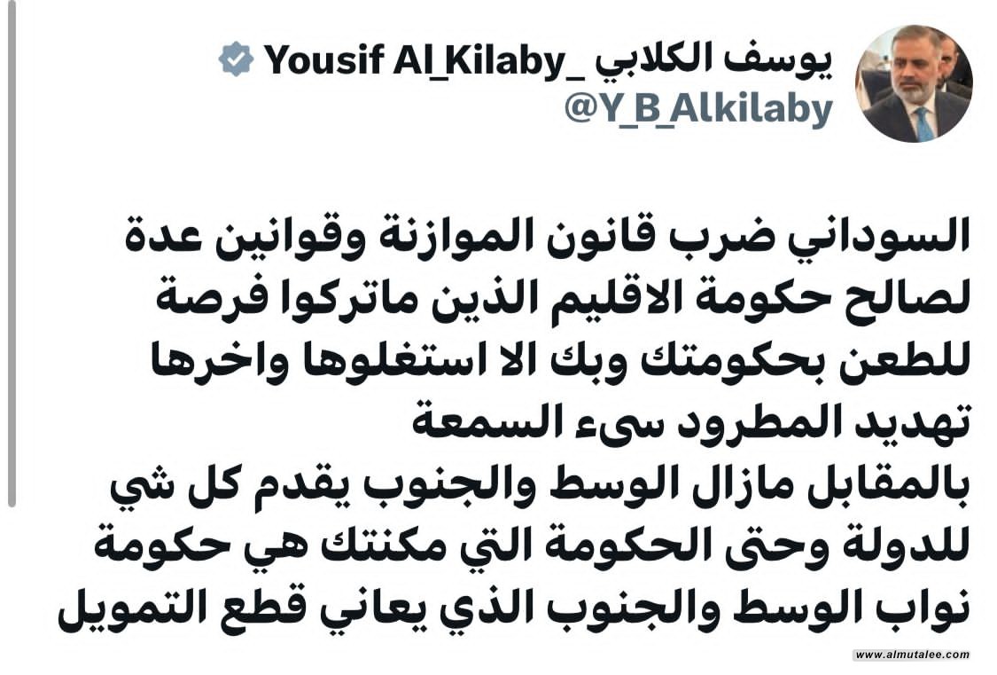 وجّه النائب يوسف الكلابي انتقادات شديدة لرئيس الوزراء محمد شياع السوداني، متهماً إياه بـ"ضرب" قانون الموازنة وعدة قوانين أخرى لصالح حكومة إقليم كردستان.