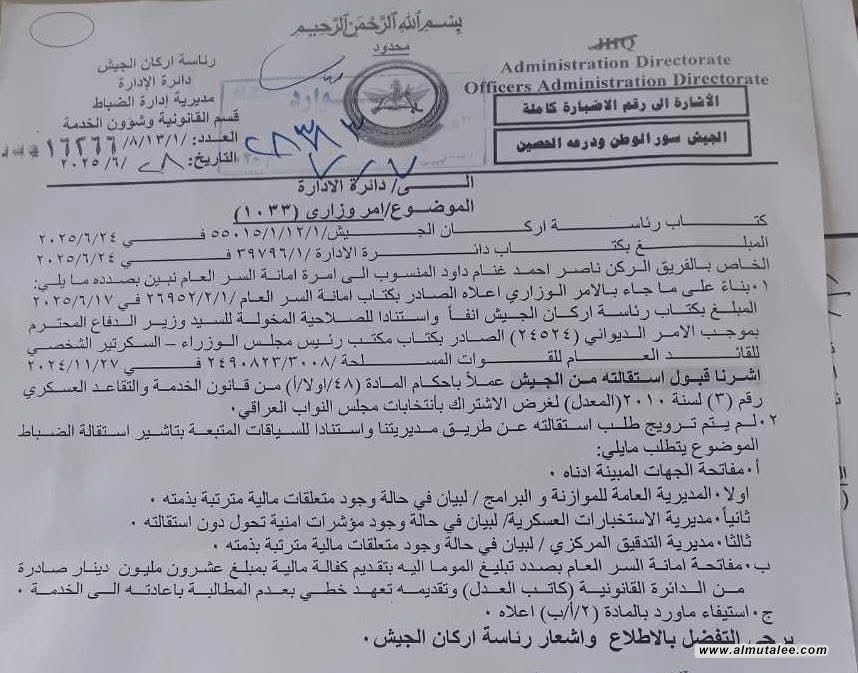 وبحسب الوثيقة أدناه والتي تلقتها "المطلع"، فإن:"الغنام لم يروج طلب استقالته عن طريق رئاسة أركان الجيش حيث جاء طلب الاستقالة لغرض الاشتراك بانتخابات مجلس النواب العراقي حيث كان قد نفى الغنام استقالته قبل عدة أيام".