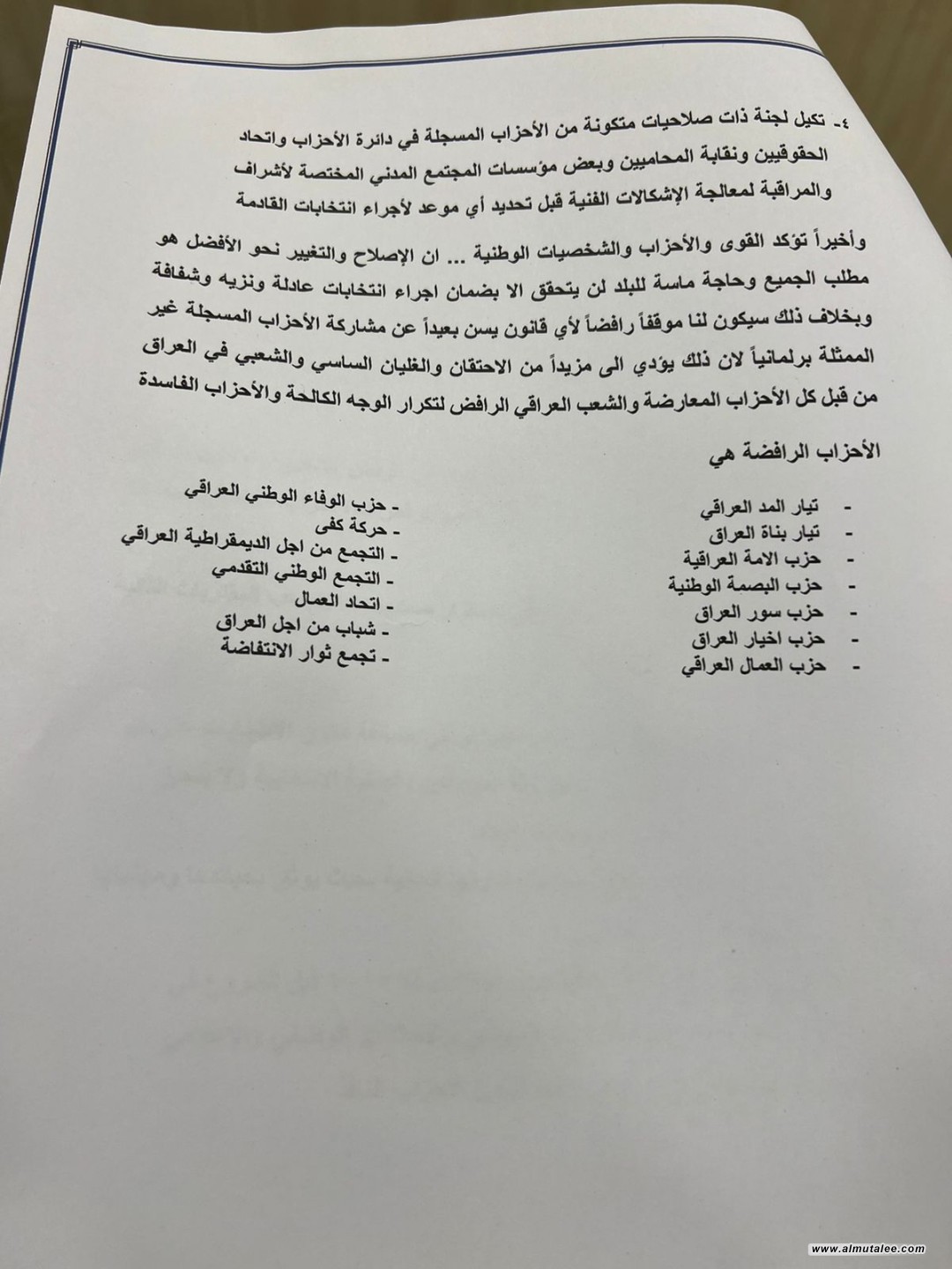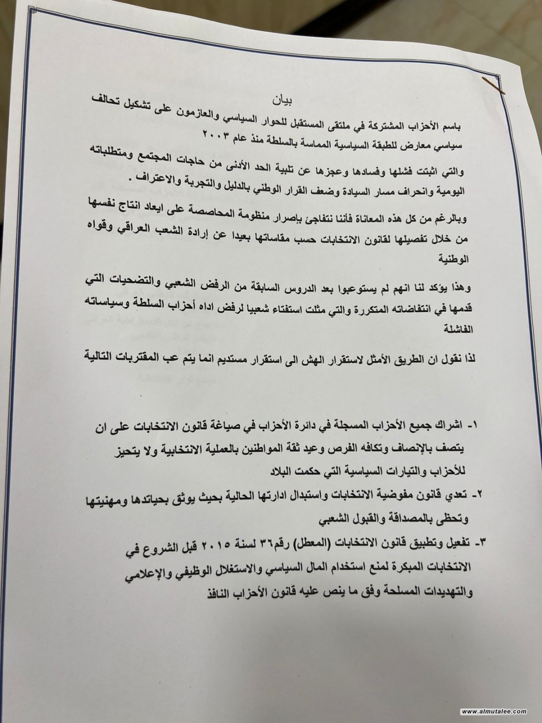 و تعتزم هذه الأحزاب والكيانات السياسية والتي يبلغ عددها 14 حزباً تشكيل تحالف سياسي معارض للطبقة السياسية المتصدية للسلطة في العراق منذ العام 2003 وسقوط نظام صدام حسين.
