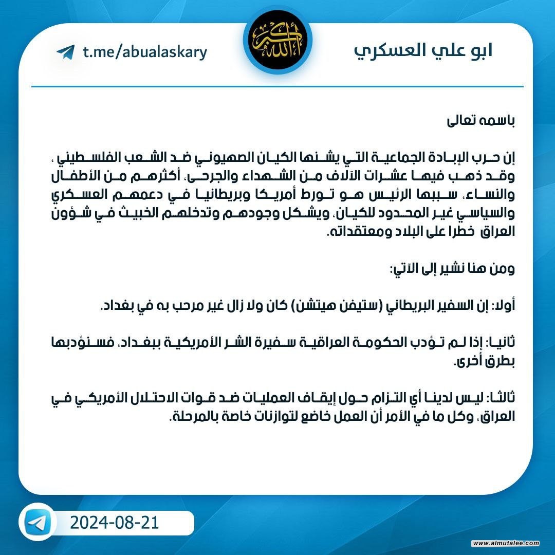 وقال العسكري في تغريدة على متصة اكس تابعته وكالة "المطلع"،إن حرب الإبادة الجماعية التي يشنها الكيان الصهيوني ضد الشعب الفلسطيني . وقد ذهب فيها عشرات الآلاف من الشهداء والجرحى، أكثرهم من الأطفال والنساء، سببها الرئيس هو تورط أمريكا وبريطانيا في دعمهم العسكري والسياسي غير المحدود للكيان، مشيرا إلى أن وجودهم وتدخلهم الخبيث في شؤون العراق يشكل خطرا على البلاد ومعتقداته.