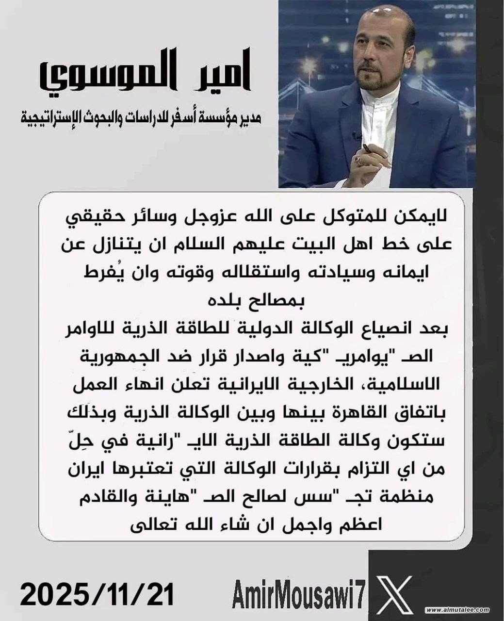 أمير الموسوي: إيران تعتبر الوكالة الذرية "منظمة تجسس" لصالح إسرائيل
