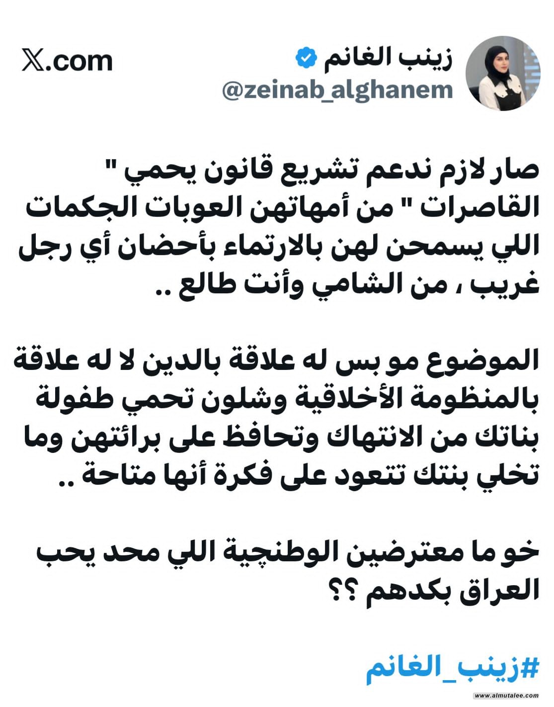 دعت الإعلامية العراقية زينب الغانم، اليوم الأحد، إلى الإسراع في سن قانون يحمي القاصرات من أي انتهاكات محتملة.
