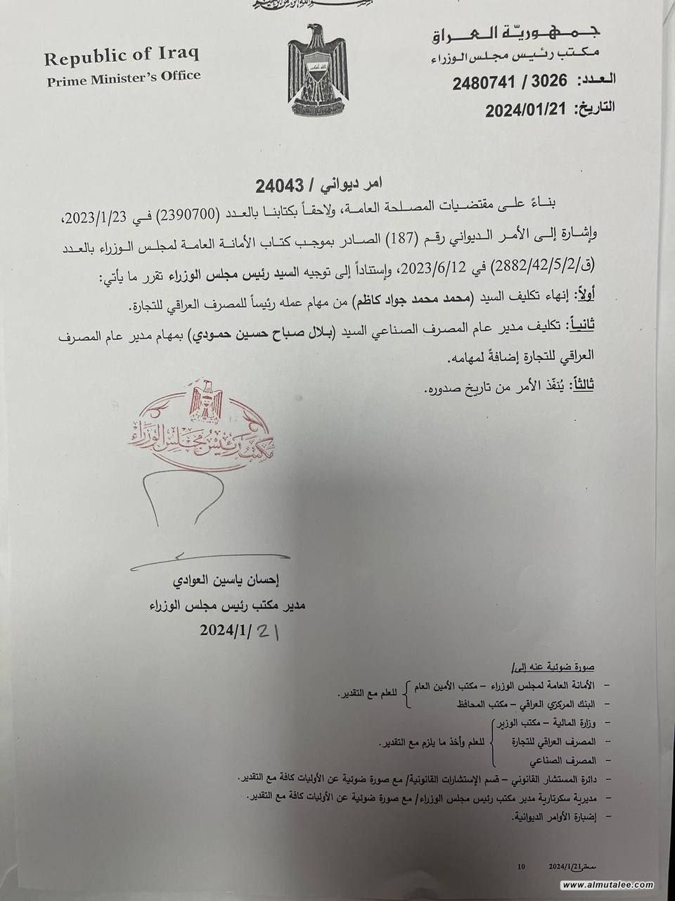 إنهاء تكليف رئيس المصرف العراقي للتجارة وتكليف مدير المصرف الصناعي بديلاً عنه (وثيقة)