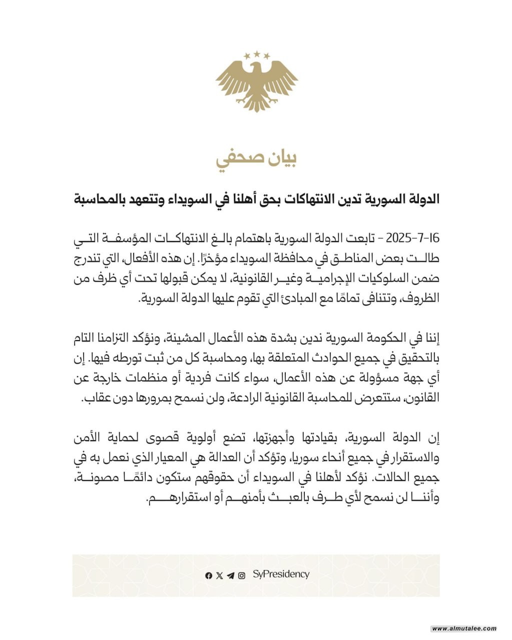 وختمت الرئاسة بالتأكيد على أن:"حقوق المواطنين في السويداء ستبقى مصانة، وأن هيبة الدولة ستُفرض وفق القانون وبما يحقق العدالة ويمنع تكرار مثل هذه الانتهاكات".