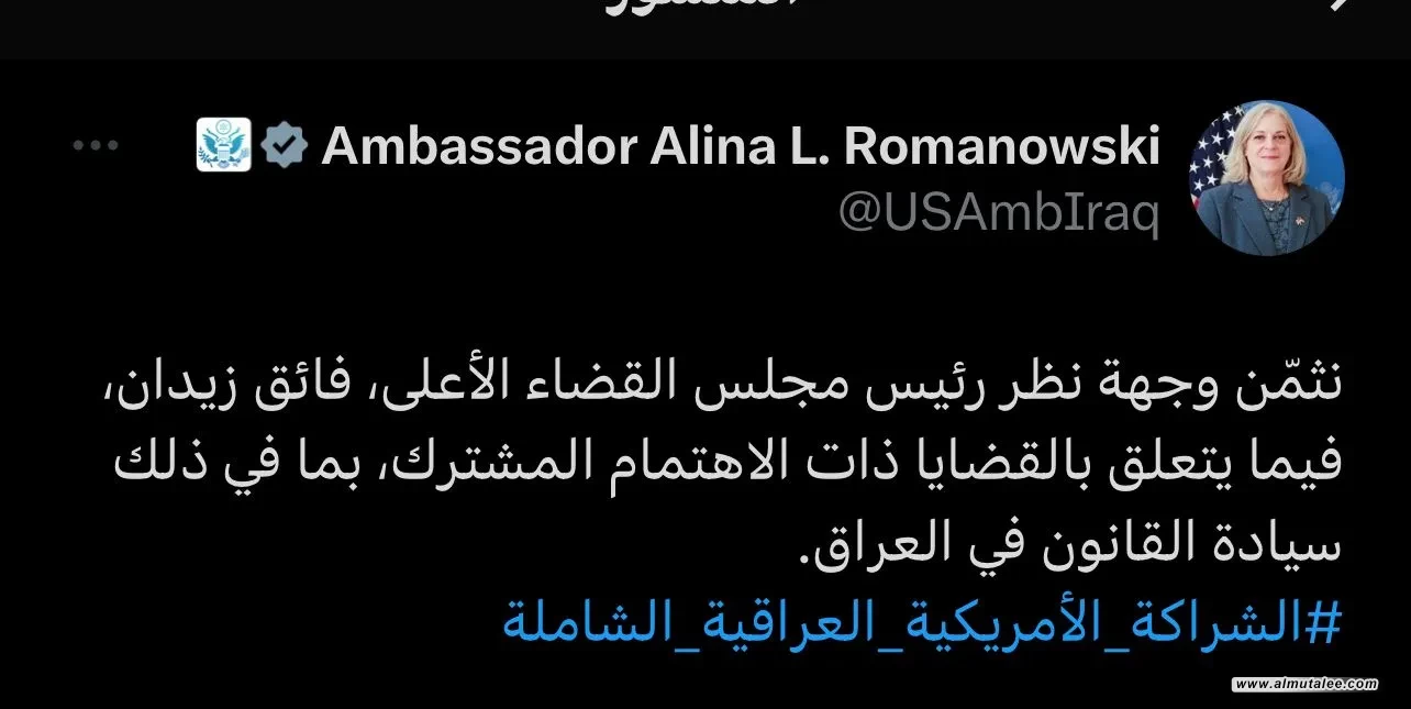 ثمنت السفيرة الأمريكية الينا رومانوسكي، اليوم الخميس، موقفا لرئيس مجلس القضاء الأعلى القاضي “فائق زيدان”.