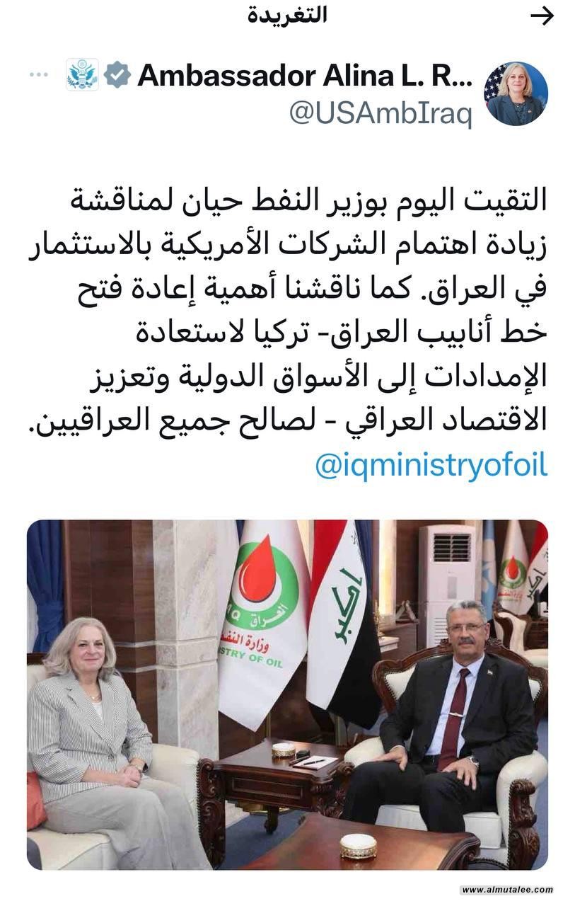 السفيرة الأميركية: ناقشت مع وزير النفط إعادة فتح خط أنابيب العراق - تركيا