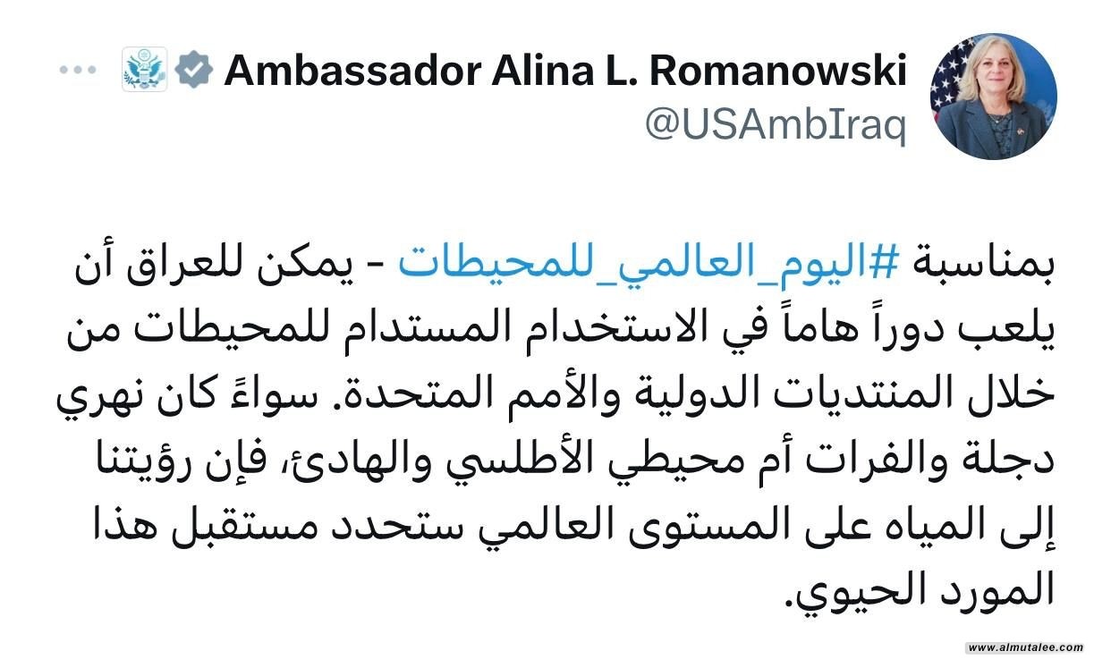 قالت سفيرة الولايات المتحدة في بغداد ألينا رومانوسكي ،اليوم الخميس، أنه يمكن للعراق أن يلعب دوراً هاماً في الاستخدام المستدام للمحيطات من خلال المنتديات الدولية والأمم المتحدة.