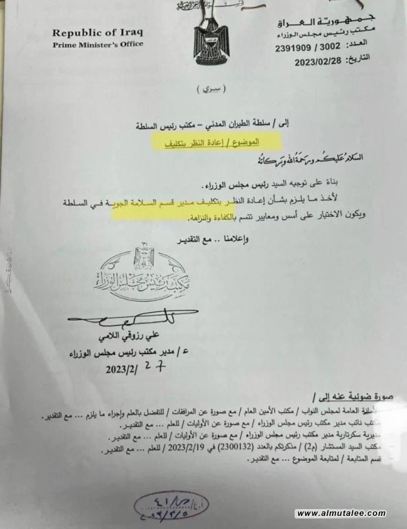 وجه رئيس مجلس الوزراء محمد شياع السوداني، بإعفاء مدير قسم السلامة الجوية في سلطة الطيران بعد ورود شكاوى بحقه.