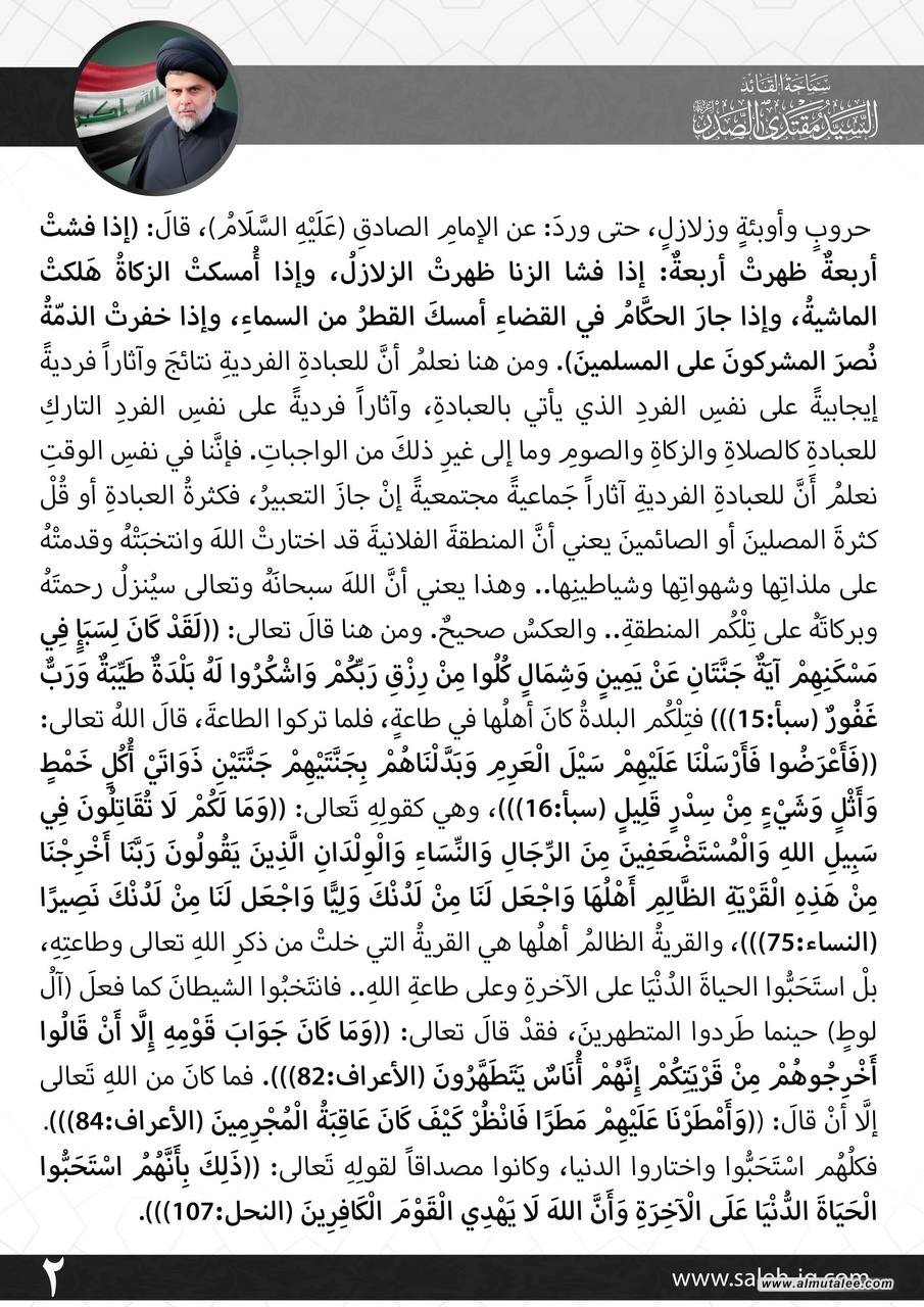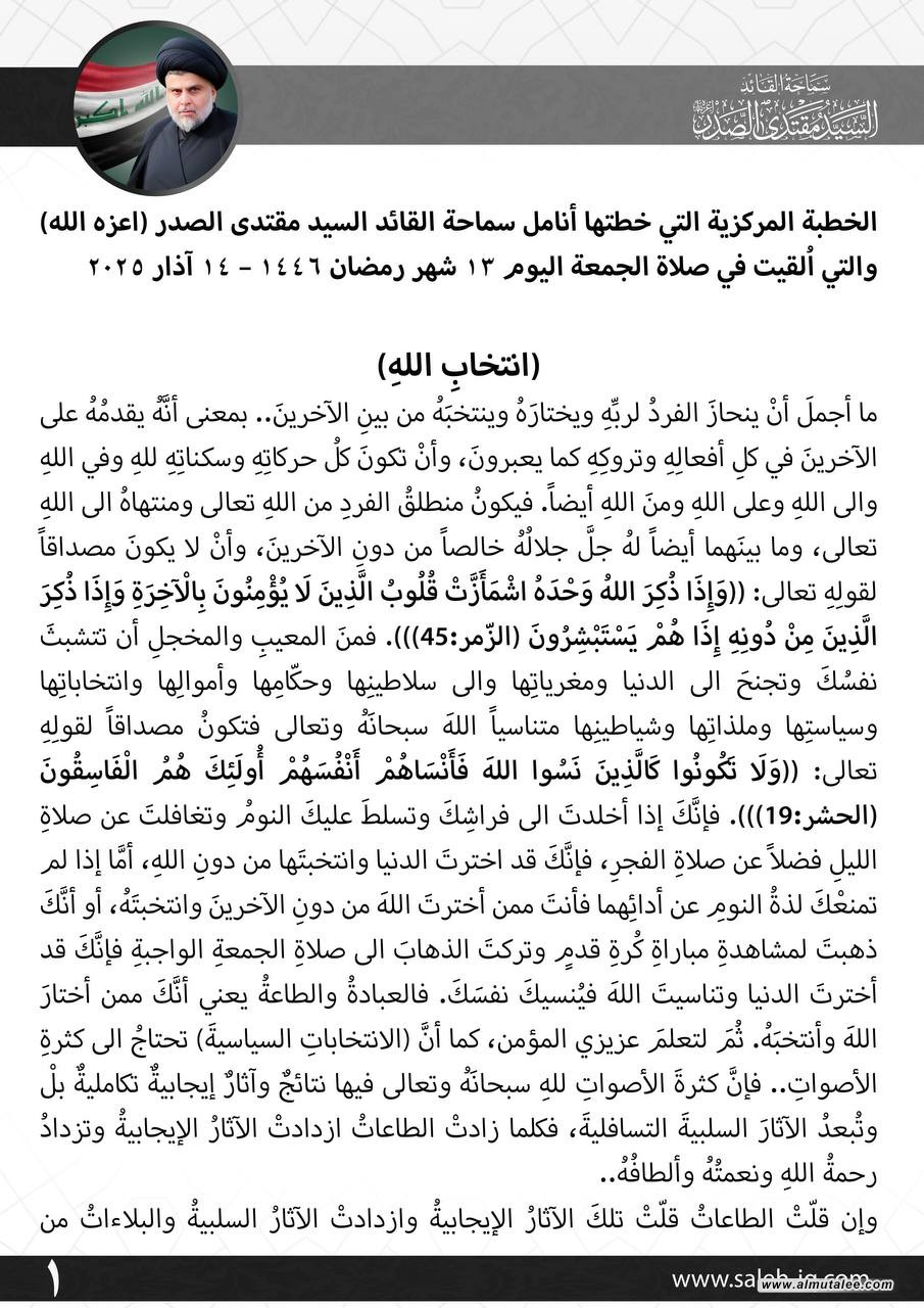 قال زعيم التيار الوطني الشيعي، مقتدى الصدر، أنَّ (الانتخاباتِ السياسيةَ) تحتاجُ الى كثرةِ الأصواتِ.. فإنَّ كثرةَ الأصواتِ للهِ سبحانَهُ وتعالى فيها نتائجٌ وآثارٌ إيجابيةٌ تكامليةٌ بلْ وتُبعدُ الآثارَ السلبيةَ التسافليةَ.