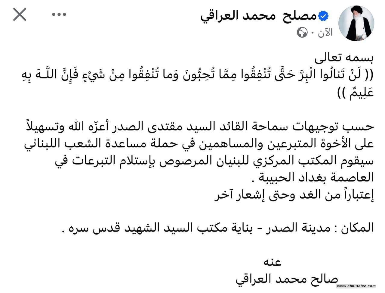 وقال صالح محمد العراقي في تدوينة على منصة (X) تابعتها وكالة"المطلع"، إنه "بحسب توجيهات الصدر وتسهيلاً على المتبرعين والمساهمين في حملة مساعدة الشعب اللبناني سيقوم المكتب المركزي للبنيان المرصوص باستلام التبرعات في (مدينة الصدر - بناية مكتب السيد الشهيد قدس سره) بالعاصمة بغداد، اعتباراً من الغد وحتى إشعار آخر".