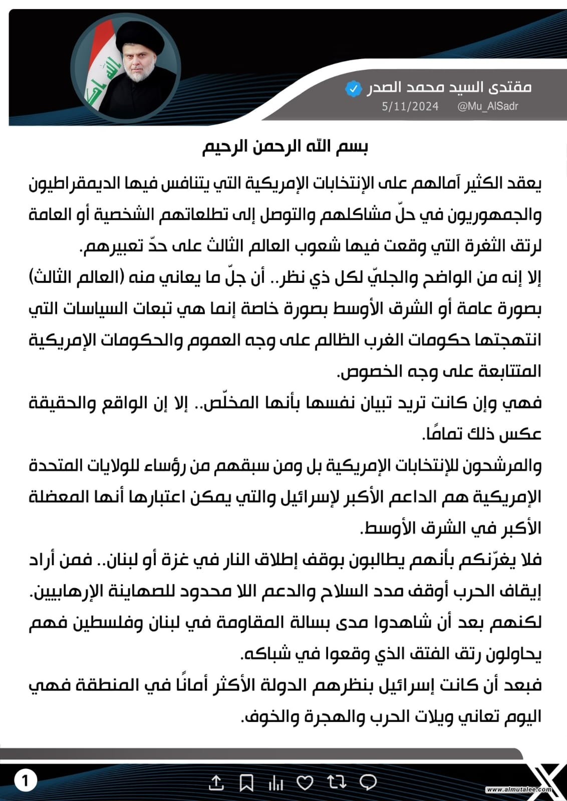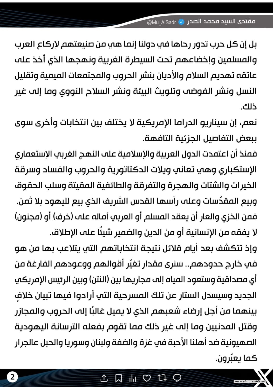 الصدر يعلق على الانتخابات الأمريكية: دراما وشريط مسجل لا يقدم ولا يؤخر