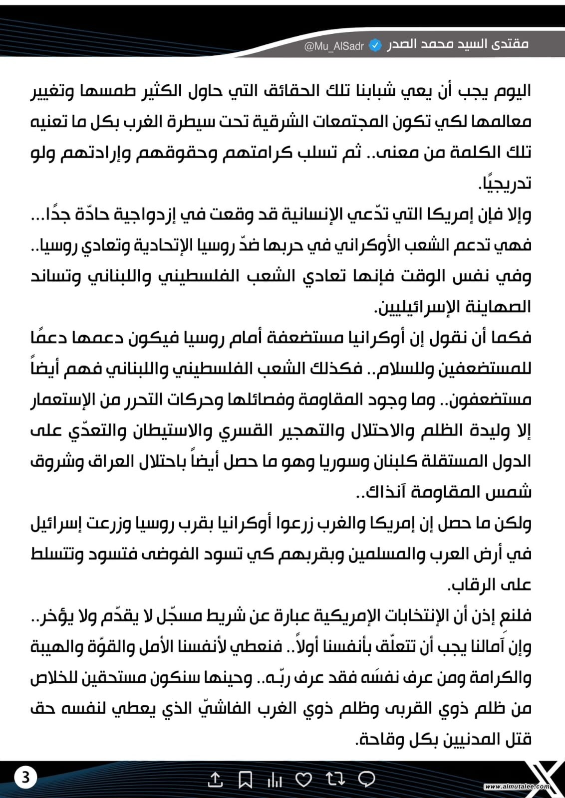 وكتب الصدر في تغريدة مطولة على حسابه الشخصي بمنصّة "إكس" وتابعتها "المطلع"، إن:"المرشحين للإنتخابات الأمريكية ومن سبقهم من رؤساء هم الداعم الأكبر لإسرائيل، والتي يمكن اعتبارها بأنها المعضلة الأكبر في الشرق الأوسط".