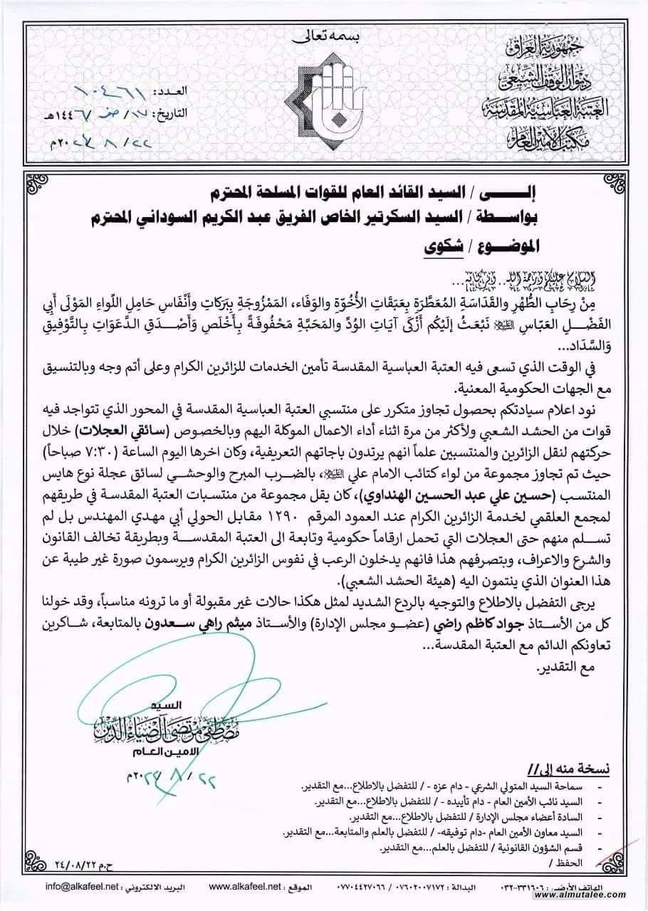 وتلقت "المطلع" على وثيقة صادرة من مكتب الأمين العام للعتبة العباسية، جاء فيها: "في الوقت الذي تسعى فيه العتبة العباسية المقدسة تأمين الخدمات للزائرين الكرام وعلى أتم وجه وبالتنسيق مع الجهات الحكومية المعنية، نود اعلامكم بحصول تجاوز متكرر على منتسبي العتبة في المحور الذي تتواجد فيه قوات من الحشد الشعبي ولأكثر من مرة اثناء أداء الاعمال الموكلة اليهم وبالخصوص (سائقي العجلات) خلال حركتهم لنقل الزائرين والمنتسبين علماً انهم يرتدون باجاتهم التعريفية".