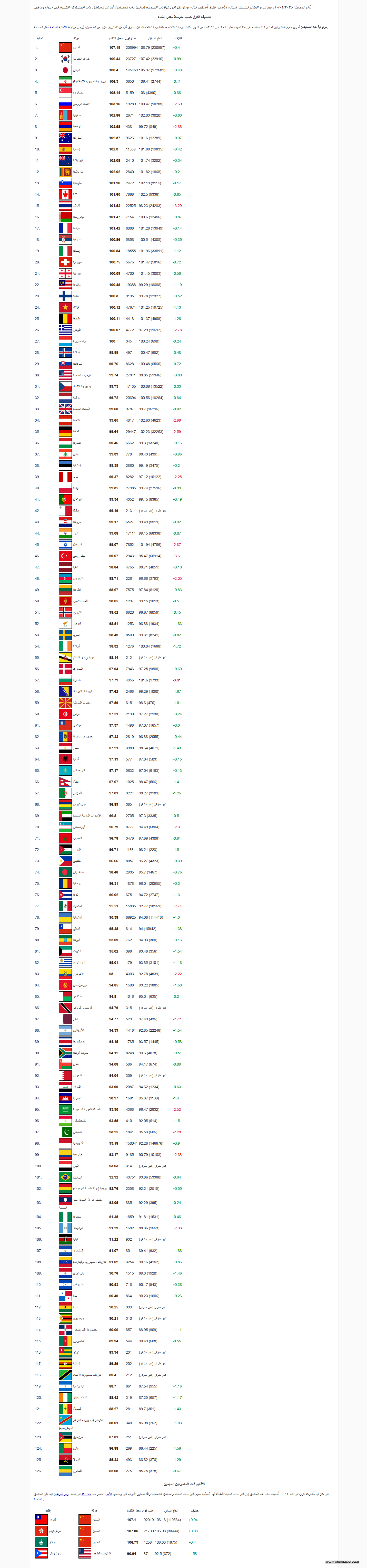 ومن جهة أخرى، تصدرت الصين القائمة بمعدل ذكاء "107.19"، تلتها كوريا الجنوبية واليابان.