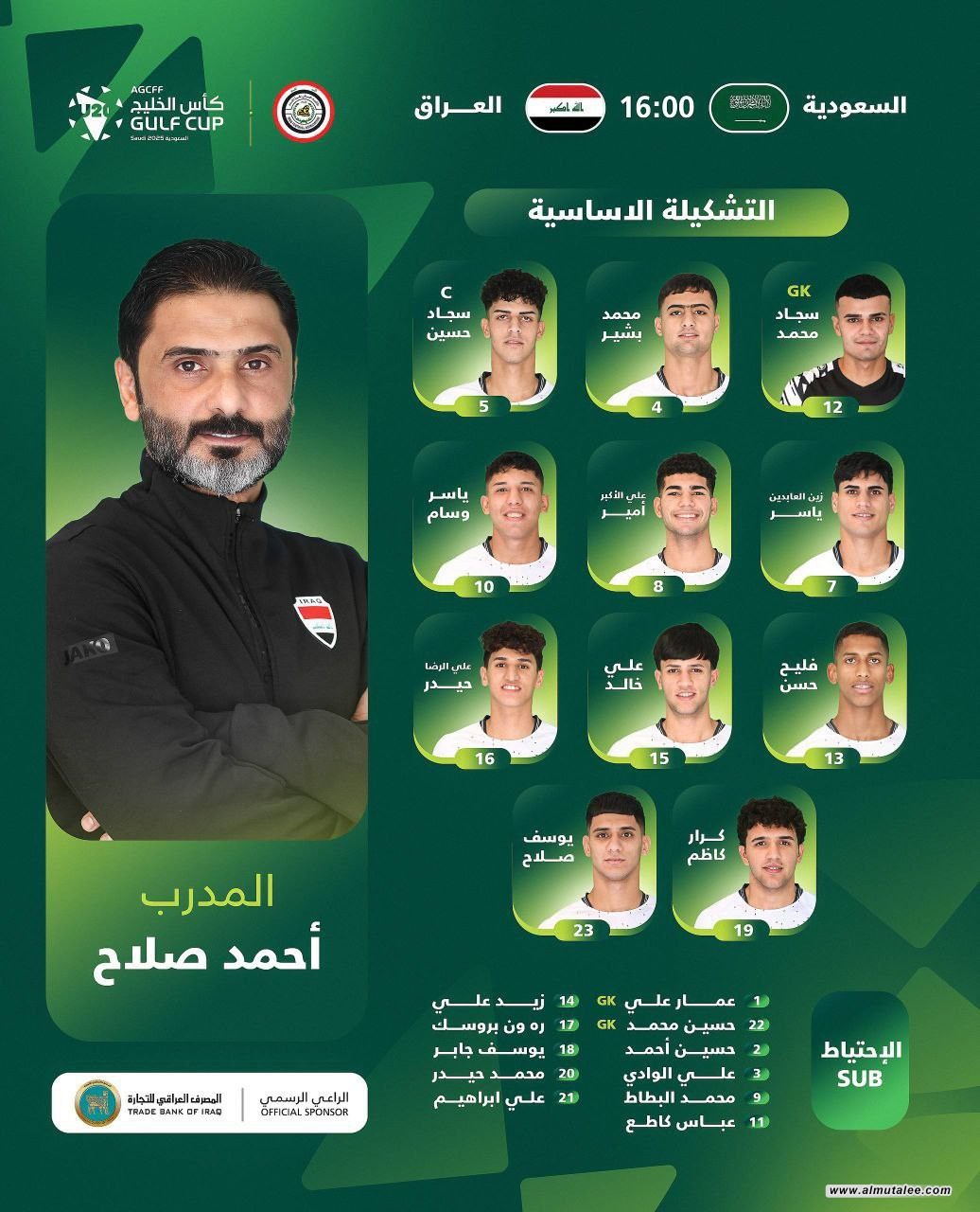أعلن المدرب أحمد صلاح، يوم الأحد، عن تشكيلةُ منتخب شباب العراق لمواجهةِ نظيره السعودي، ضمن الدور نصف النهائي لمنافساتِ بطولةِ كأس الخليج دون 20 عاماً التي تستضيفها مدينةُ أبها السعودية.