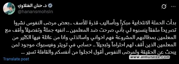 وقالت الفتلاوي في تدوينة على منصة (إكس) وتابعتها المطلع: "بدأت الحملة الانتخابية مبكراً وبأساليب قذرة للأسف"، مشيرةً إلى أن: "بعض مرضى النفوس نشروا تصريحاً ملفقاً ينسبوه لي بأني صرحت ضد المعلمين، وانفيه جملةً وتفصيلاً وأقف مع المعلمين بمطالبهم المشروعة فهم اخواني واساتذتي وانا من عائلة فيها الكثير من المعلمين الذين أقف لهم احتراماً وتبجيلاً".