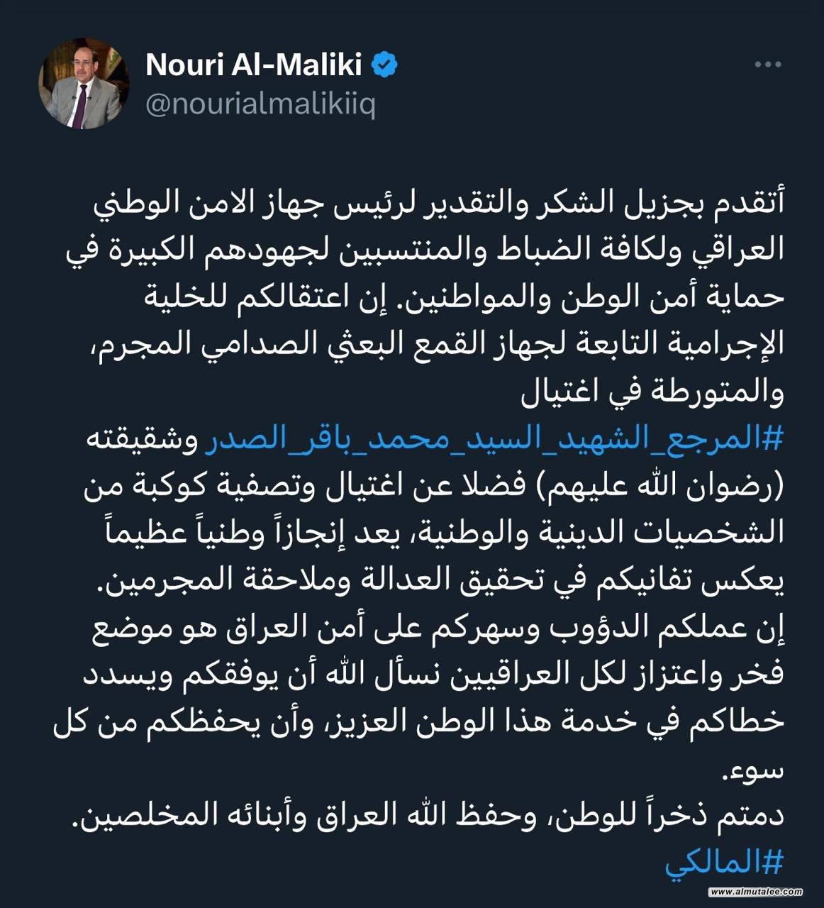 وقال المالكي في تدوينة له على منصة "إكس"- تابعتها "المطلع"، انه:"أتقدم بجزيل الشكر والتقدير لرئيس جهاز الأمن الوطني العراقي وللضباط والمنتسبين كافة؛ لجهودهم الكبيرة في حماية أمن الوطن والمواطنين".