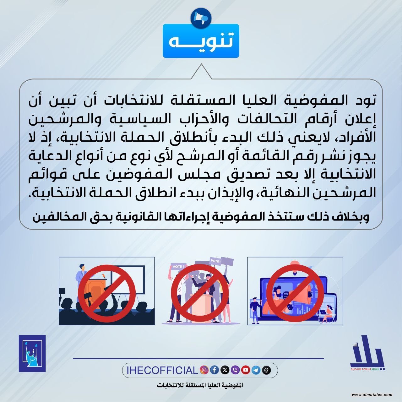 وأوضحت المفوضية حسب البيان، أنه "لا يجوز نشر رقم القائمة أو المرشح لأي نوع من أنواع الدعاية الانتخابية إلا بعد تصديق مجلس المفوضين على قوائم المرشحين النهائية، والإيذان ببدء انطلاق الحملة الانتخابية"، مؤكدة أنه "بخلاف ذلك ستتخذ المفوضية إجراءاتها القانونية بحق المخالفين".