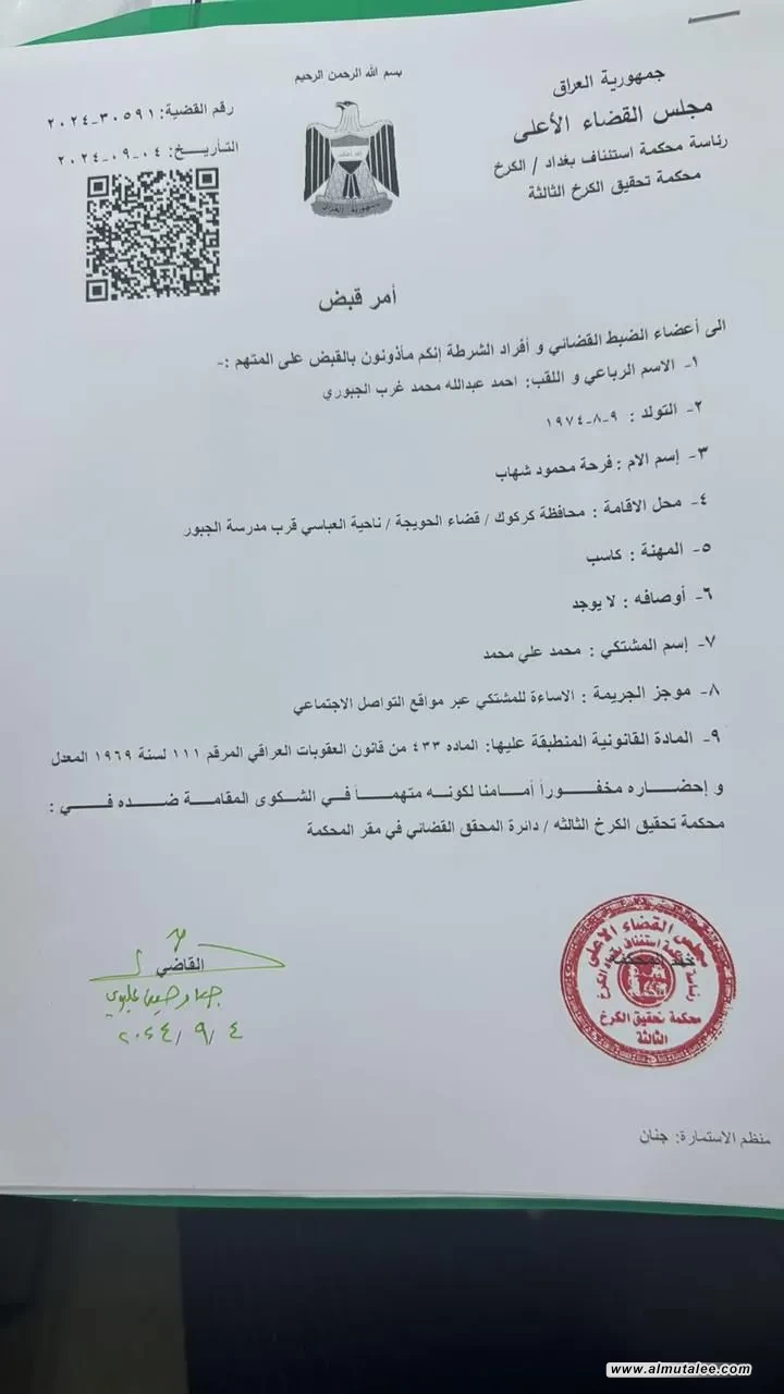 اصدرت محكمة تحقيق الكرخ، اليوم الأربعاء، مذكرة قبض بحق رئيس تحالف عزم في كركوك أحمد عبدالله الغرب الجبوري بتهمة السب والقذف.