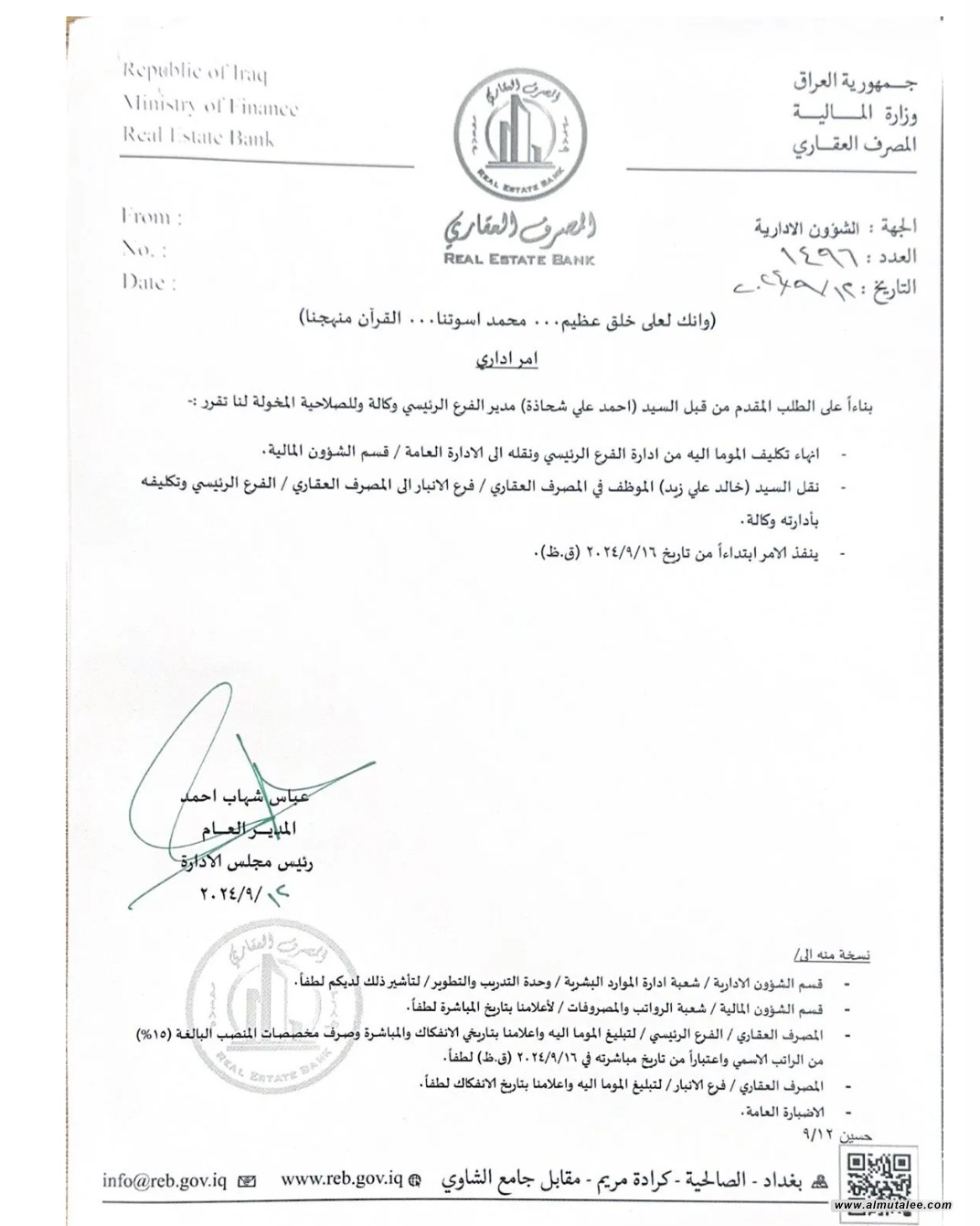 وأشار إلى"تكليف خالد علي زيد بإدارة الفرع الرئيس، بدلا عن شحاذة".